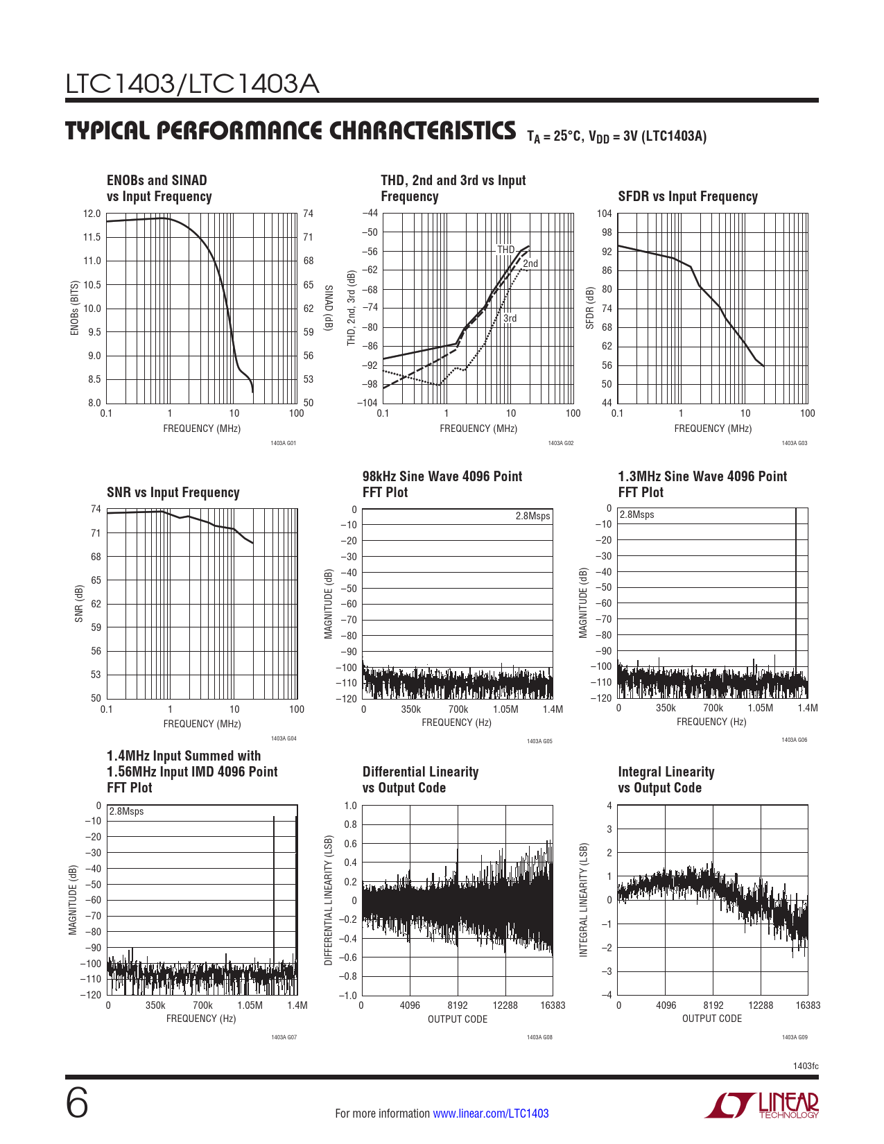 | Páginas / Página | 22 / 6 — typical perFormance characteristics TA = 25°C, VDD = 3V (LTC1403A). ENOBs … |