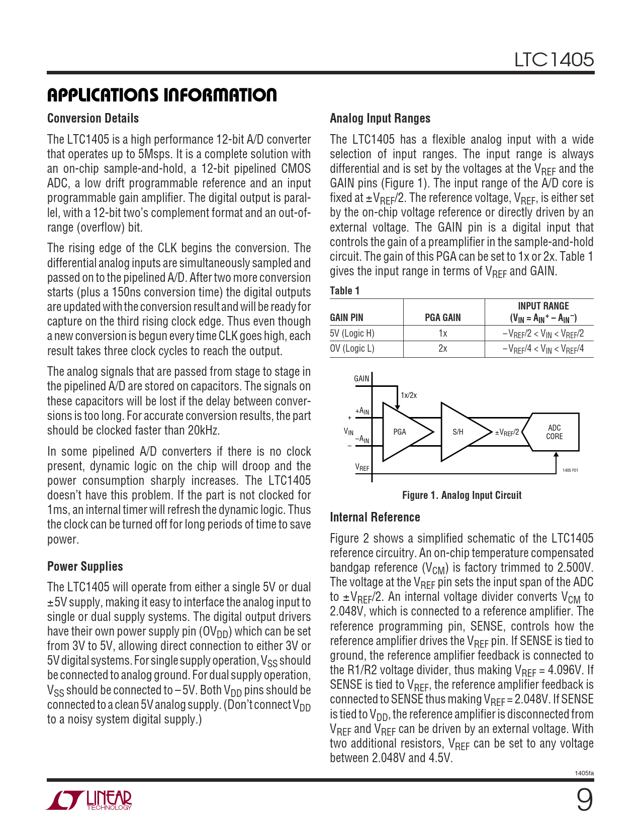 LTC1405 UUWUAPPLICATIO S I FOR ATIOConversion DetailsAnalog Input Ranges The LTC1405 is a high performance 12-bit A/D converter The LTC1405 has a flexible analog input with a wide that operates up to 5Msps. It is a complete solution with selection of input ranges. The input range is always an on-chip sample-and-hold, a 12-bit pipelined CMOS differential and is set by the voltages at the VREF and the ADC, a low drift programmable reference and an input GAIN pins (Figure 1). The input range of the A/D core is programmable gain amplifier. The digital output is paral- fixed at ±VREF/2. The reference voltage, VREF, is either set lel, with a 12-bit two’s complement format and an out-of- by the on-chip voltage reference or directly driven by an range (overflow) bit. external voltage. The GAIN pin is a digital input that controls the gain of a preamplifier in the sample-and-hold The rising edge of the CLK begins the conversion. The circuit. The gain of this PGA can be set to 1x or 2x. Table 1 differential analog inputs are simultaneously sampled and gives the input range in terms of V passed on to the pipelined A/D. After two more conversion REF and GAIN. starts (plus a 150ns conversion time) the digital outputs Table 1 are updated with the conversion result and will be ready for INPUT RANGE+– capture on the third rising clock edge. Thus even though GAIN PINPGA GAIN(VIN = AIN – AIN ) a new conversion is begun every time CLK goes high, each 5V (Logic H) 1x – VREF/2 < VIN < VREF/2 result takes three clock cycles to reach the output. OV (Logic L) 2x – VREF/4 < VIN < VREF/4 The analog signals that are passed from stage to stage in GAIN the pipelined A/D are stored on capacitors. The signals on 1x/2x these capacitors will be lost if the delay between conver- sions is too long. For accurate conversion results, the part +AIN + should be clocked faster than 20kHz. V ADC IN PGA S/H ±VREF/2 –A CORE IN – In some pipelined A/D converters if there is no clock present, dynamic logic on the chip will droop and the VREF 1405 F01 power consumption sharply increases. The LTC1405 doesn’t have this problem. If the part is not clocked for Figure 1. Analog Input Circuit 1ms, an internal timer will refresh the dynamic logic. Thus Internal Reference the clock can be turned off for long periods of time to save power. Figure 2 shows a simplified schematic of the LTC1405 reference circuitry. An on-chip temperature compensated Power Supplies bandgap reference (VCM) is factory trimmed to 2.500V. The LTC1405 will operate from either a single 5V or dual The voltage at the VREF pin sets the input span of the ADC ±5V supply, making it easy to interface the analog input to to ±VREF/2. An internal voltage divider converts VCM to single or dual supply systems. The digital output drivers 2.048V, which is connected to a reference amplifier. The have their own power supply pin (OV reference programming pin, SENSE, controls how the DD) which can be set from 3V to 5V, allowing direct connection to either 3V or reference amplifier drives the VREF pin. If SENSE is tied to 5V digital systems. For single supply operation, V ground, the reference amplifier feedback is connected to SS should be connected to analog ground. For dual supply operation, the R1/R2 voltage divider, thus making VREF = 4.096V. If V SENSE is tied to VREF, the reference amplifier feedback is SS should be connected to – 5V. Both VDD pins should be connected to a clean 5V analog supply. (Don’t connect V connected to SENSE thus making VREF = 2.048V. If SENSE DD to a noisy system digital supply.) is tied to VDD, the reference amplifier is disconnected from VREF and VREF can be driven by an external voltage. With two additional resistors, VREF can be set to any voltage between 2.048V and 4.5V. 1405fa 9