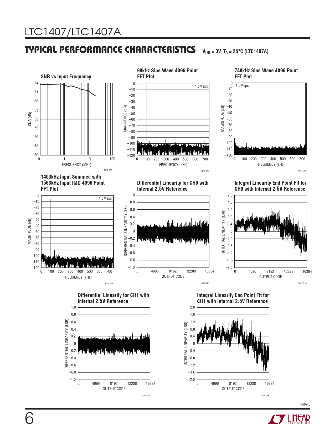 | Páginas / Página | 24 / 6 — TYPICAL PERFORMANCE CHARACTERISTICS VDD = 3V, TA = 25°C (LTC1407A). 98kHz … |