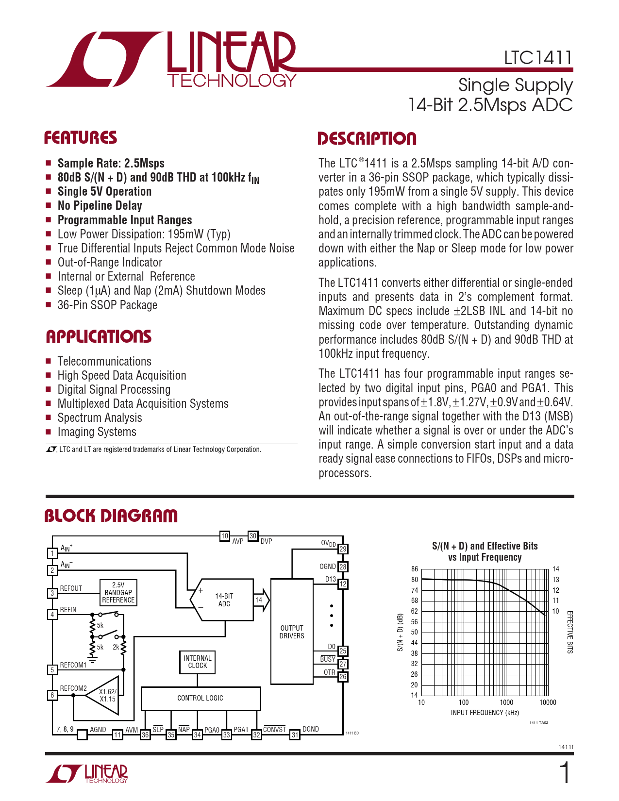 LTC1411 Single Supply 14-Bit 2.5Msps ADC UFEATURESDESCRIPTIO ■ Sample Rate: 2.5Msps The LTC ®1411 is a 2.5Msps sampling 14-bit A/D con- ■ 80dB S/(N + D) and 90dB THD at 100kHz f verter in a 36-pin SSOP package, which typically dissi- IN ■ Single 5V Operation pates only 195mW from a single 5V supply. This device ■ No Pipeline Delay comes complete with a high bandwidth sample-and- ■ Programmable Input Ranges hold, a precision reference, programmable input ranges ■ Low Power Dissipation: 195mW (Typ) and an internally trimmed clock. The ADC can be powered ■ True Differential Inputs Reject Common Mode Noise down with either the Nap or Sleep mode for low power ■ Out-of-Range Indicator applications. ■ Internal or External Reference The LTC1411 converts either differential or single-ended ■ Sleep (1µA) and Nap (2mA) Shutdown Modes inputs and presents data in 2’s complement format. ■ 36-Pin SSOP Package Maximum DC specs include ±2LSB INL and 14-bit no U missing code over temperature. Outstanding dynamic APPLICATIO S performance includes 80dB S/(N + D) and 90dB THD at 100kHz input frequency. ■ Telecommunications ■ High Speed Data Acquisition The LTC1411 has four programmable input ranges se- ■ Digital Signal Processing lected by two digital input pins, PGA0 and PGA1. This ■ Multiplexed Data Acquisition Systems provides input spans of ±1.8V, ±1.27V, ±0.9V and ±0.64V. ■ Spectrum Analysis An out-of-the-range signal together with the D13 (MSB) ■ Imaging Systems will indicate whether a signal is over or under the ADC’s input range. A simple conversion start input and a data , LTC and LT are registered trademarks of Linear Technology Corporation. ready signal ease connections to FIFOs, DSPs and micro- processors. WBLOCK DIAGRA 10 30 AVP DVP OV + DD A S/(N + D) and Effective Bits IN 29 1 vs Input Frequency A – IN OGND 28 2 86 14 D13 80 13 2.5V 12 REFOUT 74 12 3 BANDGAP + 14-BIT REFERENCE 14 68 11 ADC REFIN – • EFFECTIVE BITS 62 10 4 • 56 5k OUTPUT • 50 DRIVERS 44 5k 2k D0 25 S/(N + D) (dB) 38 INTERNAL BUSY REFCOM1 CLOCK 27 32 5 OTR 26 26 20 REFCOM2 X1.62/ 6 CONTROL LOGIC 14 X1.15 10 100 1000 10000 INPUT FREQUENCY (kHz) 1411 TA02 7, 8, 9 AGND AVM SLP NAP PGA0 PGA1 CONVST DGND 1411 BD 11 36 35 34 33 32 31 1411f 1