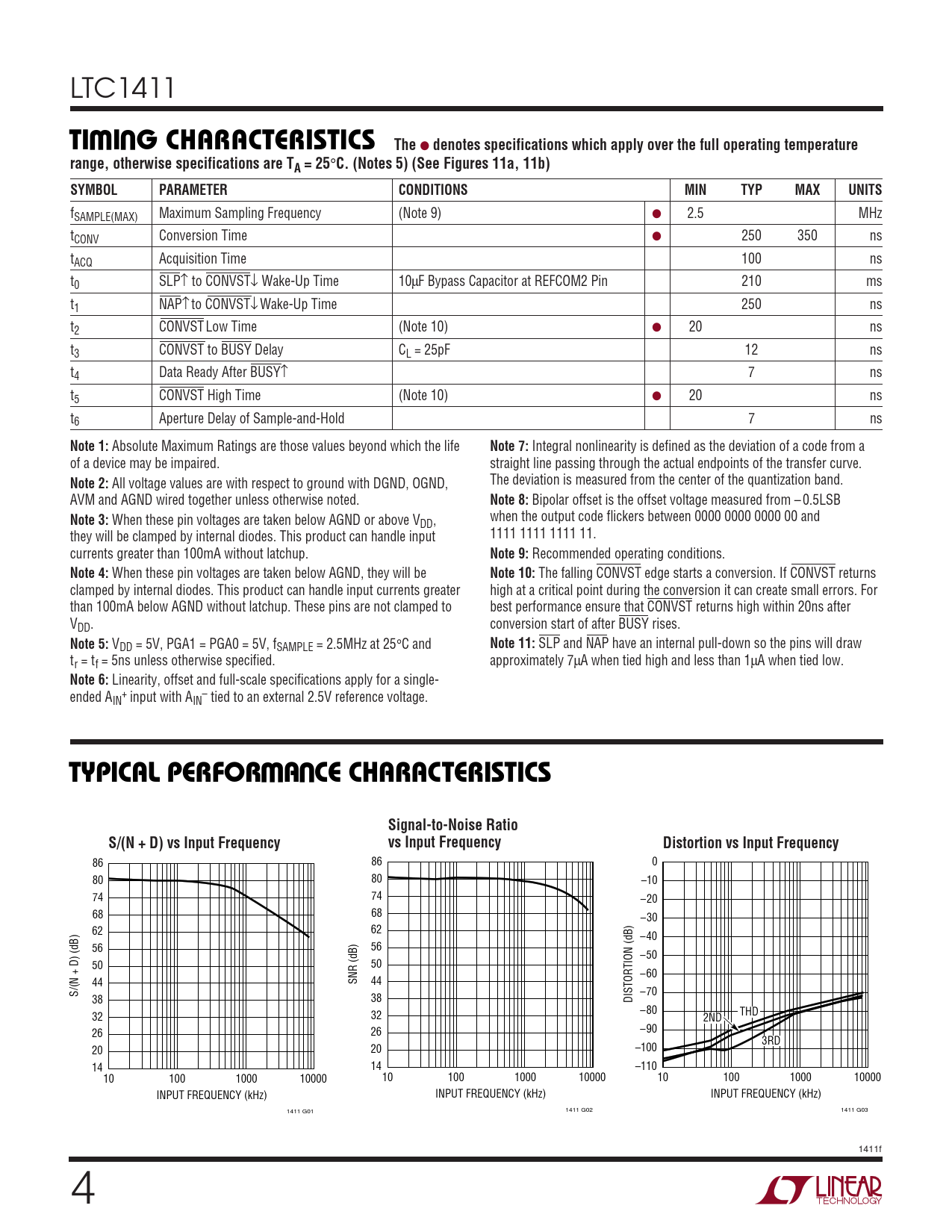 86 86 0 80 80 –10 74 74 –20 68 68 –30 62 62 –40 56 56 –50 50 50 –60 44 SNR (dB) 44 S/(N + D) (dB) –70 38 38 DISTORTION (dB) –80 32 32 THD 2ND 26 26 –90 3RD 20 20 –100 14 14 –110 10 100 1000 10000 10 100 1000 10000 10 100 1000 10000 INPUT FREQUENCY (kHz) INPUT FREQUENCY (kHz) INPUT FREQUENCY (kHz) 1411 G01 1411 G02 1411 G03 1411f 4