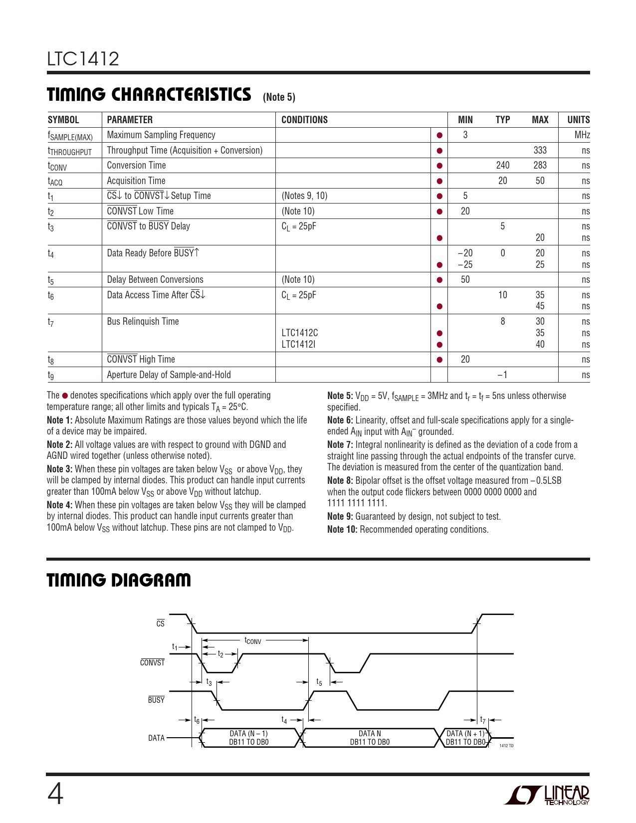 fSAMPLE(MAX) Maximum Sampling Frequency ● 3 MHz tTHROUGHPUT Throughput Time (Acquisition + Conversion) ● 333 ns tCONV Conversion Time ● 240 283 ns tACQ Acquisition Time ● 20 50 ns t1 CS↓ to CONVST↓ Setup Time (Notes 9, 10) ● 5 ns t2 CONVST Low Time (Note 10) ● 20 ns t3 CONVST to BUSY Delay CL = 25pF 5 ns ● 20 ns t4 Data Ready Before BUSY↑ – 20 0 20 ns ● – 25 25 ns t5 Delay Between Conversions (Note 10) ● 50 ns t6 Data Access Time After CS↓ CL = 25pF 10 35 ns ● 45 ns t7 Bus Relinquish Time 8 30 ns LTC1412C ● 35 ns LTC1412I ● 40 ns t8 CONVST High Time ● 20 ns t9 Aperture Delay of Sample-and-Hold – 1 ns The ● denotes specifications which apply over the full operating