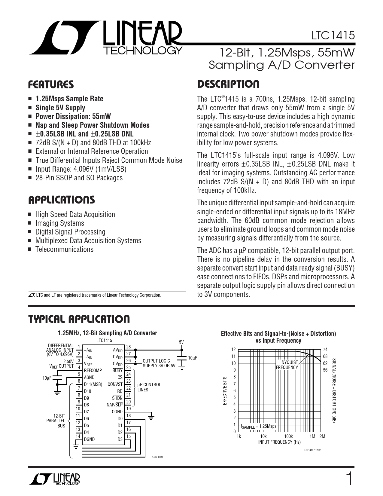LTC1415 12-Bit, 1.25Msps, 55mW Sampling A/D Converter UFEATUSREDESCRIPTIO ■ 1.25Msps Sample Rate The LTC®1415 is a 700ns, 1.25Msps, 12-bit sampling ■ Single 5V Supply A/D converter that draws only 55mW from a single 5V ■ Power Dissipation: 55mW supply. This easy-to-use device includes a high dynamic ■ Nap and Sleep Power Shutdown Modes range sample-and-hold, precision reference and a trimmed ■ ± 0.35LSB INL and ± 0.25LSB DNL internal clock. Two power shutdown modes provide flex- ■ 72dB S/(N + D) and 80dB THD at 100kHz ibility for low power systems. ■ External or Internal Reference Operation The LTC1415’s full-scale input range is 4.096V. Low ■ True Differential Inputs Reject Common Mode Noise linearity errors ±0.35LSB INL, ± 0.25LSB DNL make it ■ Input Range: 4.096V (1mV/LSB) ideal for imaging systems. Outstanding AC performance ■ 28-Pin SSOP and SO Packages includes 72dB S/(N + D) and 80dB THD with an input frequency of 100kHz. OUAPPLICATIS The unique differential input sample-and-hold can acquire ■ single-ended or differential input signals up to its 18MHz High Speed Data Acquisition ■ bandwidth. The 60dB common mode rejection allows Imaging Systems ■ users to eliminate ground loops and common mode noise Digital Signal Processing ■ by measuring signals differentially from the source. Multiplexed Data Acquisition Systems ■ Telecommunications The ADC has a µP compatible, 12-bit parallel output port. There is no pipeline delay in the conversion results. A separate convert start input and data ready signal (BUSY) ease connections to FIFOs, DSPs and microprocessors. A separate output logic supply pin allows direct connection , LTC and LT are registered trademarks of Linear Technology Corporation. to 3V components. OUTYPICAL APPLICATI1.25MHz, 12-Bit Sampling A/D ConverterEffective Bits and Signal-to-(Noise + Distortion) LTC1415 5V vs Input Frequency DIFFERENTIAL 1 28 ANALOG INPUT +AIN AVDD 12 74 2 27 (0V TO 4.096V) –AIN DVDD 10µF 11 68 SIGNAL/(NOISE + DISTORTION) (dB) 3 26 2.50V OUTPUT LOGIC V NYQUIST REF OVDD 10 62 VREF OUTPUT 4 25 SUPPLY 3V OR 5V FREQUENCY REFCOMP BUSY 9 56 5 24 10µF AGND CS 8 6 23 D11(MSB) CONVST µP CONTROL 7 7 22 D10 RD LINES 6 8 21 D9 SHDN 5 9 20 D8 NAP/SLP EFFECTIVE BITS 4 10 19 D7 OGND 3 12-BIT 11 18 D6 D0 2 PARALLEL 12 17 BUS D5 D1 1 fSAMPLE = 1.25Msps 13 16 D4 D2 0 14 15 1k 10k 100k 1M 2M DGND D3 INPUT FREQUENCY (Hz) LTC1415 • TA02 1415 TA01 1
