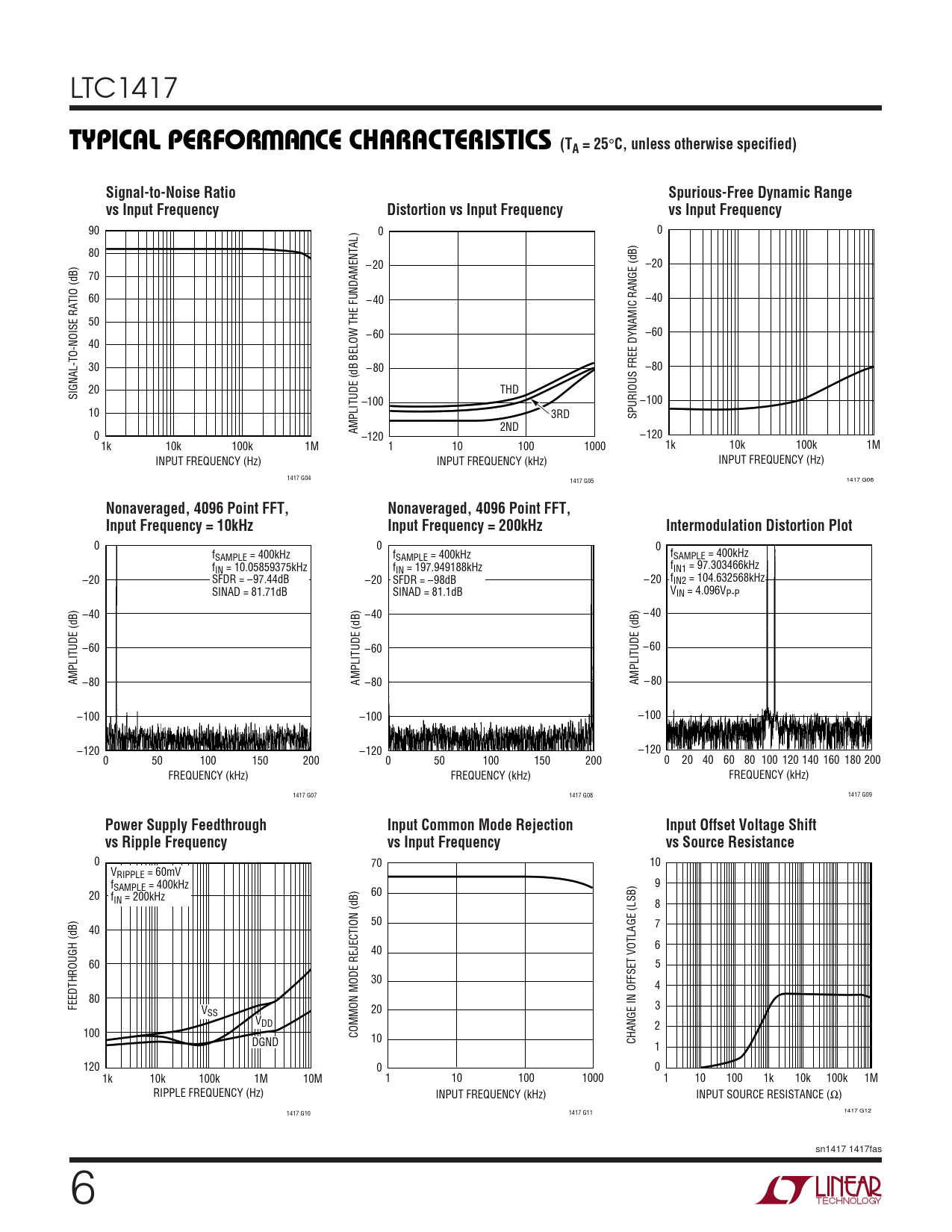 90 0 0 80 – 20 –20 70 60 – 40 –40 50 – 60 –60 40 30 – 80 –80 20 THD SIGNAL-TO-NOISE RATIO (dB) –100 –100 10 3RD SPURIOUS FREE DYNAMIC RANGE (dB) AMPLITUDE (dB BELOW THE FUNDAMENTAL) 2ND 0 –120 –120 1k 10k 100k 1M 1 10 100 1000 1k 10k 100k 1M INPUT FREQUENCY (Hz) INPUT FREQUENCY (kHz) INPUT FREQUENCY (Hz) 1417 G04 1417 G05 1417 G06