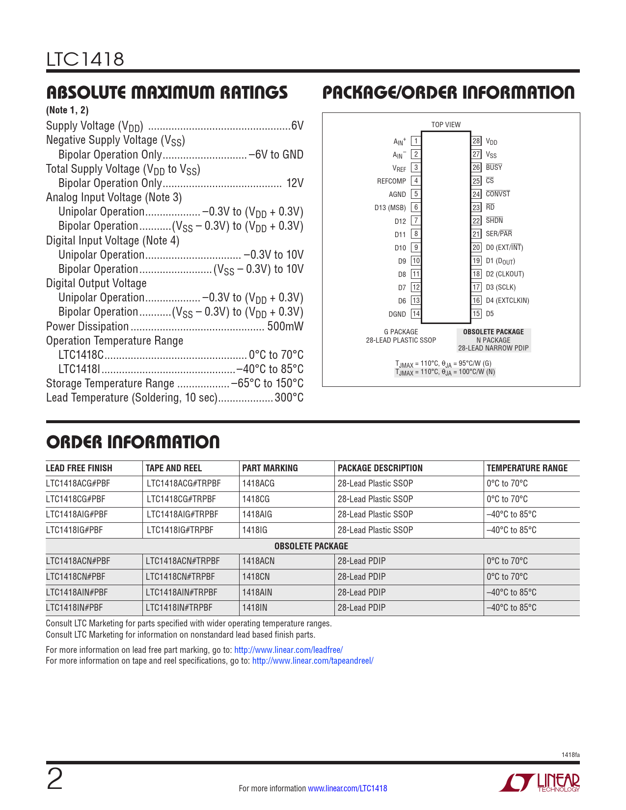 Operation Temperature Range 28-LEAD PLASTIC SSOP N PACKAGE LTC1418C ... 0°C to 70°C 28-LEAD NARROW PDIP LTC1418I ..–40°C to 85°C TJMAX = 110°C, θJA = 95°C/W (G) TJMAX = 110°C, θJA = 100°C/W (N) Storage Temperature Range .. –65°C to 150°C Lead Temperature (Soldering, 10 sec) ...300°C