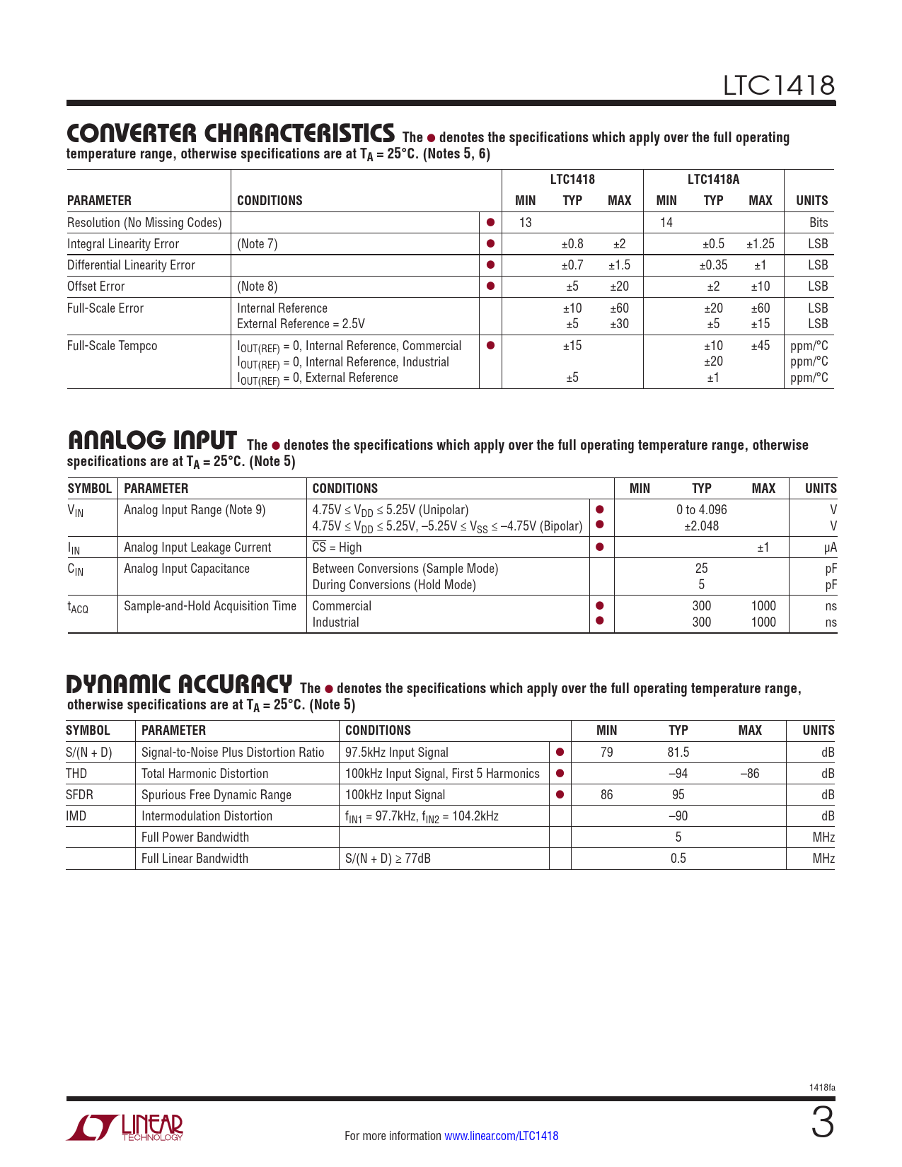 denotes the specifications which apply over the full operating temperature range, otherwise specifications are at TA = 25°C. (Notes 5, 6) LTC1418 LTC1418A PARAMETER CONDITIONS MIN TYP MAX MIN TYP MAX UNITS