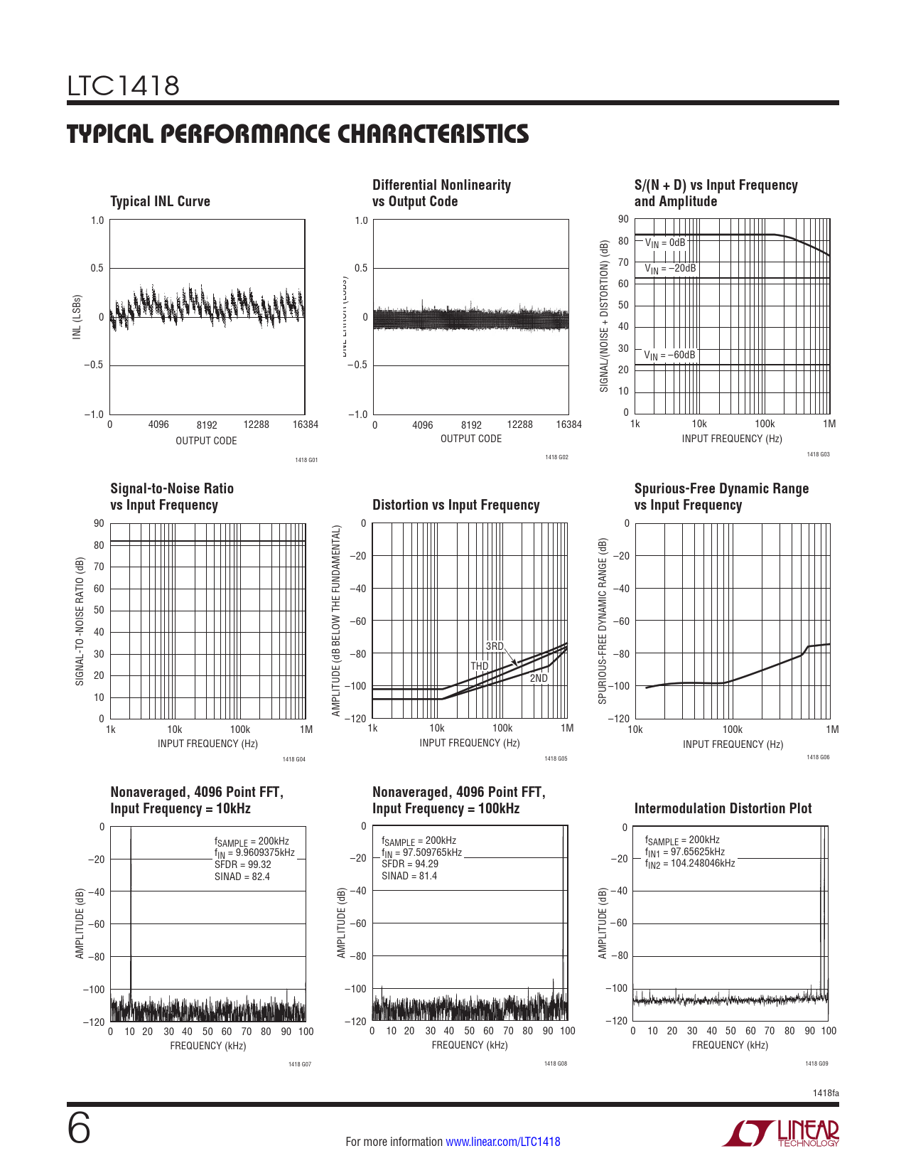 90 0 0 80 –20 –20 70 60 –40 –40 50 –60 –60 40 3RD 30 –80 –80 THD 20 SIGNAL-TO -NOISE RATIO (dB) 2ND –100 –100 10 SPURIOUS-FREE DYNAMIC RANGE (dB) 0 AMPLITUDE (dB BELOW THE FUNDAMENTAL) –120 –120 1k 10k 100k 1M 1k 10k 100k 1M 10k 100k 1M INPUT FREQUENCY (Hz) INPUT FREQUENCY (Hz) INPUT FREQUENCY (Hz) 1418 G04 1418 G05 1418 G06