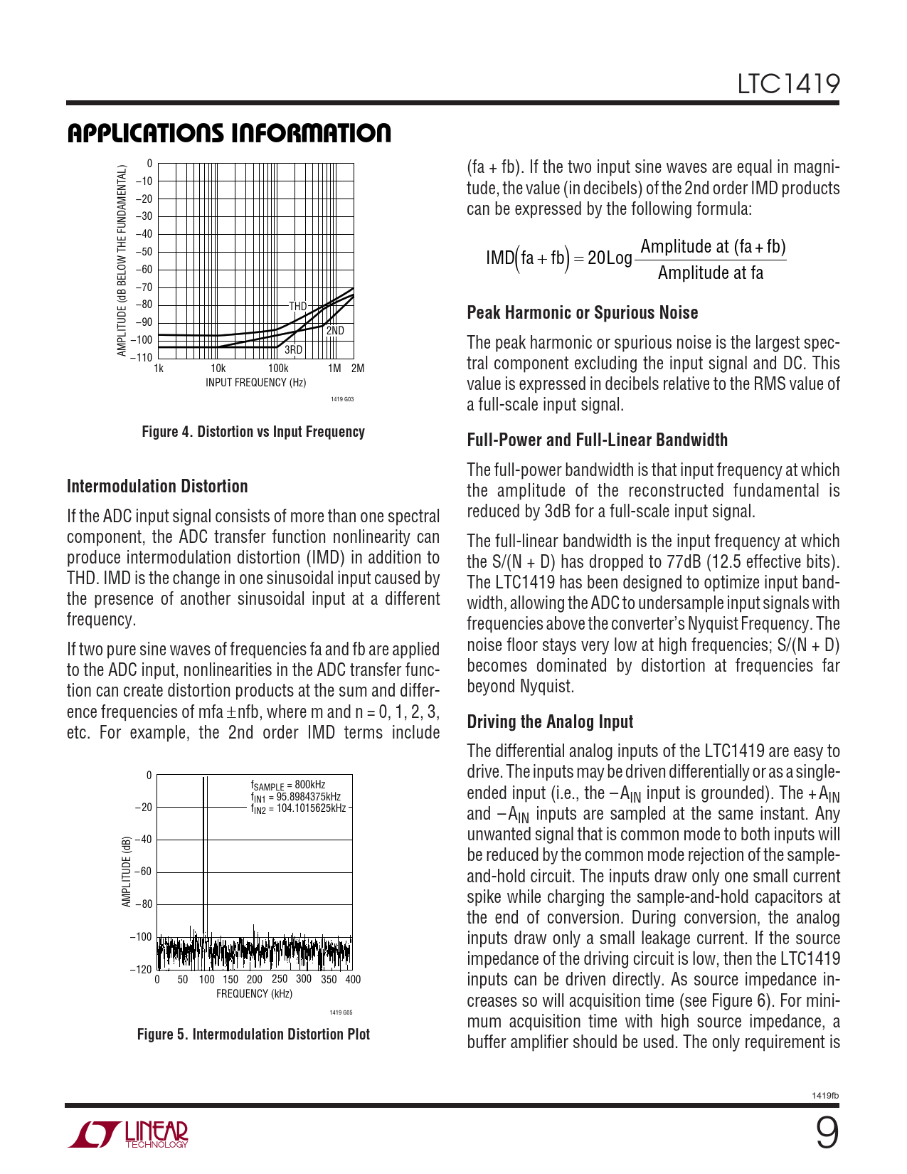the amplitude of the reconstructed fundamental is If the ADC input signal consists of more than one spectral reduced by 3dB for a full-scale input signal. component, the ADC transfer function nonlinearity can The full-linear bandwidth is the input frequency at which produce intermodulation distortion (IMD) in addition to the S/(N + D) has dropped to 77dB (12.5 effective bits). THD. IMD is the change in one sinusoidal input caused by The LTC1419 has been designed to optimize input band- the presence of another sinusoidal input at a different width, allowing the ADC to undersample input signals with frequency. frequencies above the converter’s Nyquist Frequency. The If two pure sine waves of frequencies fa and fb are applied noise floor stays very low at high frequencies; S/(N + D) to the ADC input, nonlinearities in the ADC transfer func- becomes dominated by distortion at frequencies far tion can create distortion products at the sum and differ- beyond Nyquist. ence frequencies of mfa ±nfb, where m and n = 0, 1, 2, 3,