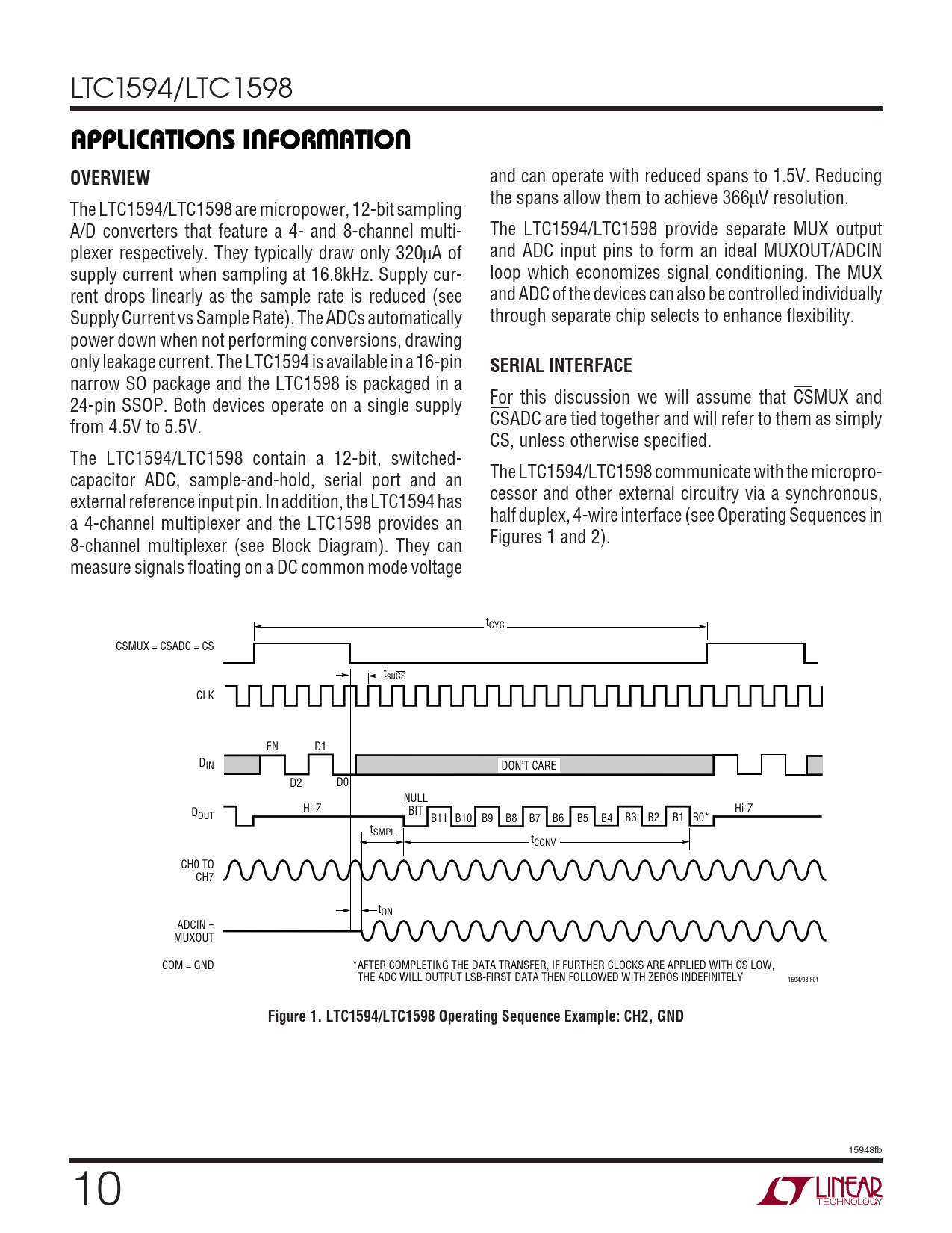 LTC1594/LTC1598 UUWUAPPLICATIONS INFORMATIONOVERVIEW and can operate with reduced spans to 1.5V. Reducing the spans allow them to achieve 366μV resolution. The LTC1594/LTC1598 are micropower, 12-bit sampling A/D converters that feature a 4- and 8-channel multi- The LTC1594/LTC1598 provide separate MUX output plexer respectively. They typically draw only 320μA of and ADC input pins to form an ideal MUXOUT/ADCIN supply current when sampling at 16.8kHz. Supply cur- loop which economizes signal conditioning. The MUX rent drops linearly as the sample rate is reduced (see and ADC of the devices can also be controlled individually Supply Current vs Sample Rate). The ADCs automatically through separate chip selects to enhance flexibility. power down when not performing conversions, drawing only leakage current. The LTC1594 is available in a 16-pin SERIAL INTERFACE narrow SO package and the LTC1598 is packaged in a 24-pin SSOP. Both devices operate on a single supply For this discussion we will assume that CSMUX and from 4.5V to 5.5V. CSADC are tied together and will refer to them as simply CS, unless otherwise specified. The LTC1594/LTC1598 contain a 12-bit, switched- capacitor ADC, sample-and-hold, serial port and an The LTC1594/LTC1598 communicate with the micropro- external reference input pin. In addition, the LTC1594 has cessor and other external circuitry via a synchronous, a 4-channel multiplexer and the LTC1598 provides an half duplex, 4-wire interface (see Operating Sequences in 8-channel multiplexer (see Block Diagram). They can Figures 1 and 2). measure signals floating on a DC common mode voltage tCYC CSMUX = CSADC = CS tsuCS CLK EN D1 DIN DON’T CARE D2 D0 NULL Hi-Z Hi-Z D BIT OUT B11 B10 B9 B8 B7 B6 B5 B4 B3 B2 B1 B0* tSMPL tCONV CH0 TO CH7 tON ADCIN = MUXOUT COM = GND *AFTER COMPLETING THE DATA TRANSFER, IF FURTHER CLOCKS ARE APPLIED WITH CS LOW, THE ADC WILL OUTPUT LSB-FIRST DATA THEN FOLLOWED WITH ZEROS INDEFINITELY 1594/98 F01 Figure 1. LTC1594/LTC1598 Operating Sequence Example: CH2, GND 15948fb 10