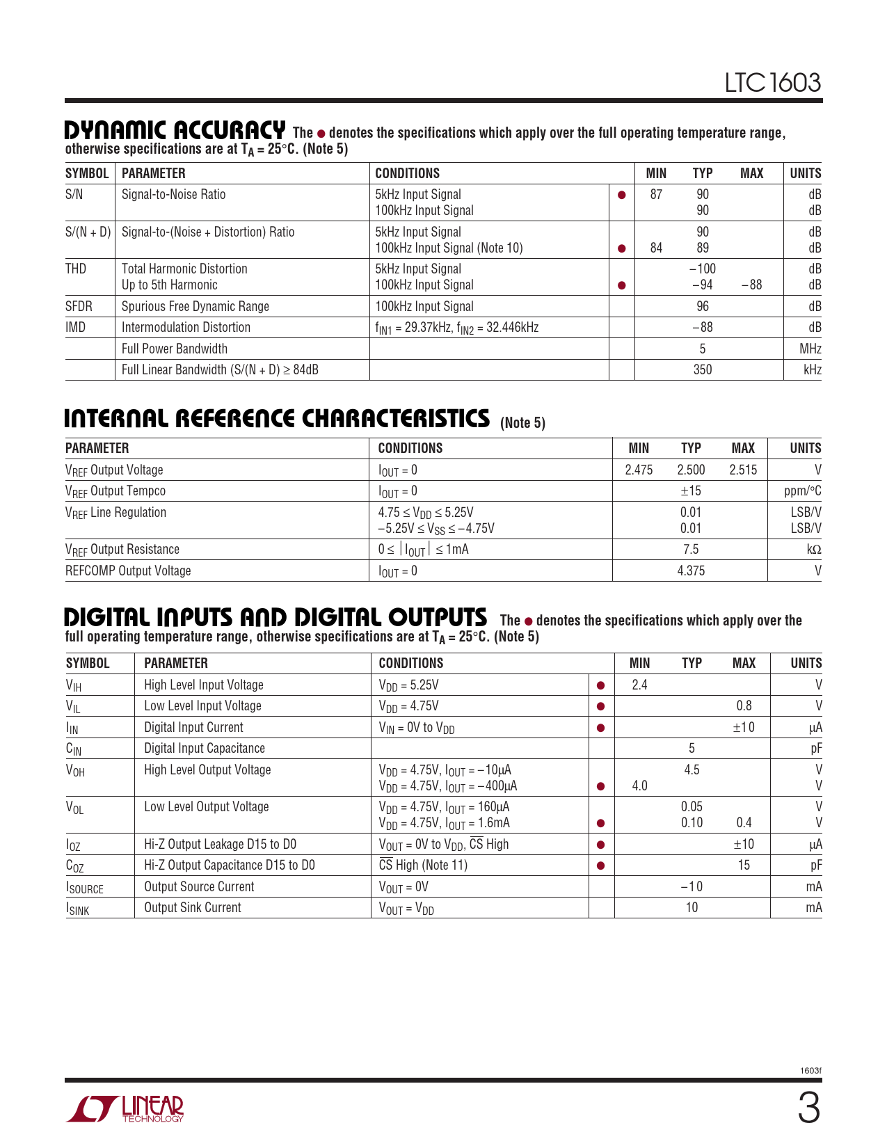 VIH High Level Input Voltage VDD = 5.25V ● 2.4 V VIL Low Level Input Voltage VDD = 4.75V ● 0.8 V IIN Digital Input Current VIN = 0V to VDD ● ±10 µA CIN Digital Input Capacitance 5 pF VOH High Level Output Voltage VDD = 4.75V, IOUT = – 10µA 4.5 V VDD = 4.75V, IOUT = – 400µA ● 4.0 V VOL Low Level Output Voltage VDD = 4.75V, IOUT = 160µA 0.05 V VDD = 4.75V, IOUT = 1.6mA ● 0.10 0.4 V IOZ Hi-Z Output Leakage D15 to D0 VOUT = 0V to VDD, CS High ● ±10 µA COZ Hi-Z Output Capacitance D15 to D0 CS High (Note 11) ● 15 pF ISOURCE Output Source Current VOUT = 0V – 1 0 mA ISINK Output Sink Current VOUT = VDD 10 mA 1603f 3