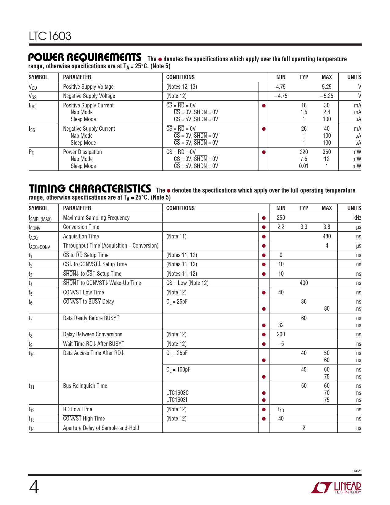 VDD Positive Supply Voltage (Notes 12, 13) 4.75 5.25 V VSS Negative Supply Voltage (Note 12) – 4.75 – 5.25 V IDD Positive Supply Current CS = RD = 0V ● 18 30 mA Nap Mode CS = 0V, SHDN = 0V 1.5 2.4 mA Sleep Mode CS = 5V, SHDN = 0V 1 100 µA ISS Negative Supply Current CS = RD = 0V ● 26 40 mA Nap Mode CS = 0V, SHDN = 0V 1 100 µA Sleep Mode CS = 5V, SHDN = 0V 1 100 µA PD Power Dissipation CS = RD = 0V ● 220 350 mW Nap Mode CS = 0V, SHDN = 0V 7.5 12 mW Sleep Mode CS = 5V, SHDN = 0V 0.01 1 mW