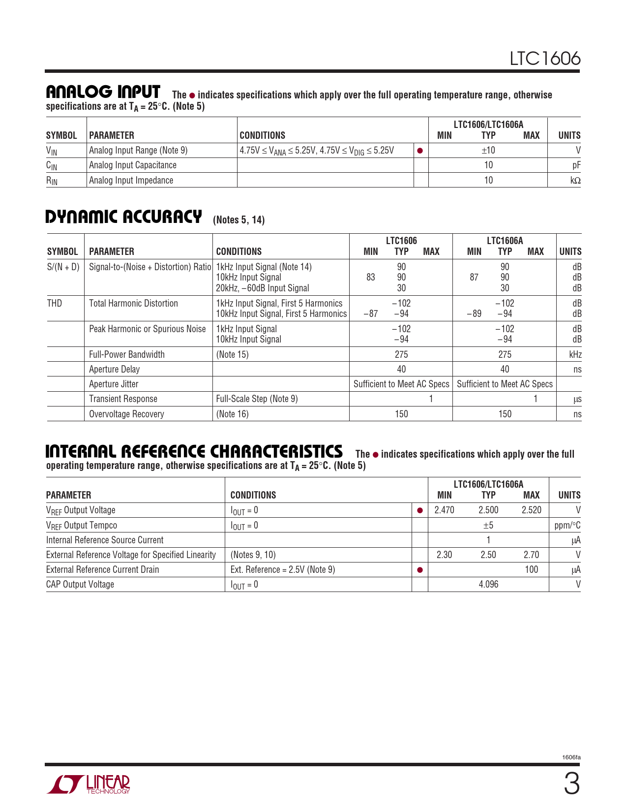 LTC1606 UUA ALOG I PUT The ● indicates specifications which apply over the full operating temperature range, otherwisespecifications are at TA = 25 ° C. (Note 5)LTC1606/LTC1606ASYMBOLPARAMETERCONDITIONSMINTYPMAXUNITS VIN Analog Input Range (Note 9) 4.75V ≤ VANA ≤ 5.25V, 4.75V ≤ VDIG ≤ 5.25V ● ±10 V CIN Analog Input Capacitance 10 pF RIN Analog Input Impedance 10 kΩ UWDY A IC ACCURACY (Notes 5, 14)LTC1606LTC1606ASYMBOLPARAMETERCONDITIONSMINTYPMAXMINTYPMAXUNITS S/(N + D) Signal-to-(Noise + Distortion) Ratio 1kHz Input Signal (Note 14) 90 90 dB 10kHz Input Signal 83 90 87 90 dB 20kHz, – 60dB Input Signal 30 30 dB THD Total Harmonic Distortion 1kHz Input Signal, First 5 Harmonics – 102 – 102 dB 10kHz Input Signal, First 5 Harmonics – 87 – 94 – 89 – 94 dB Peak Harmonic or Spurious Noise 1kHz Input Signal – 102 – 102 dB 10kHz Input Signal – 94 – 94 dB Full-Power Bandwidth (Note 15) 275 275 kHz Aperture Delay 40 40 ns Aperture Jitter Sufficient to Meet AC Specs Sufficient to Meet AC Specs Transient Response Full-Scale Step (Note 9) 1 1 µs Overvoltage Recovery (Note 16) 150 150 ns UUUI TER AL REFERE CE CHARACTERISTICS The ● indicates specifications which apply over the fulloperating temperature range, otherwise specifications are at TA = 25 ° C. (Note 5)LTC1606/LTC1606APARAMETERCONDITIONSMINTYPMAXUNITS VREF Output Voltage IOUT = 0 ● 2.470 2.500 2.520 V VREF Output Tempco IOUT = 0 ±5 ppm/°C Internal Reference Source Current 1 µA External Reference Voltage for Specified Linearity (Notes 9, 10) 2.30 2.50 2.70 V External Reference Current Drain Ext. Reference = 2.5V (Note 9) ● 100 µA CAP Output Voltage IOUT = 0 4.096 V 1606fa 3
