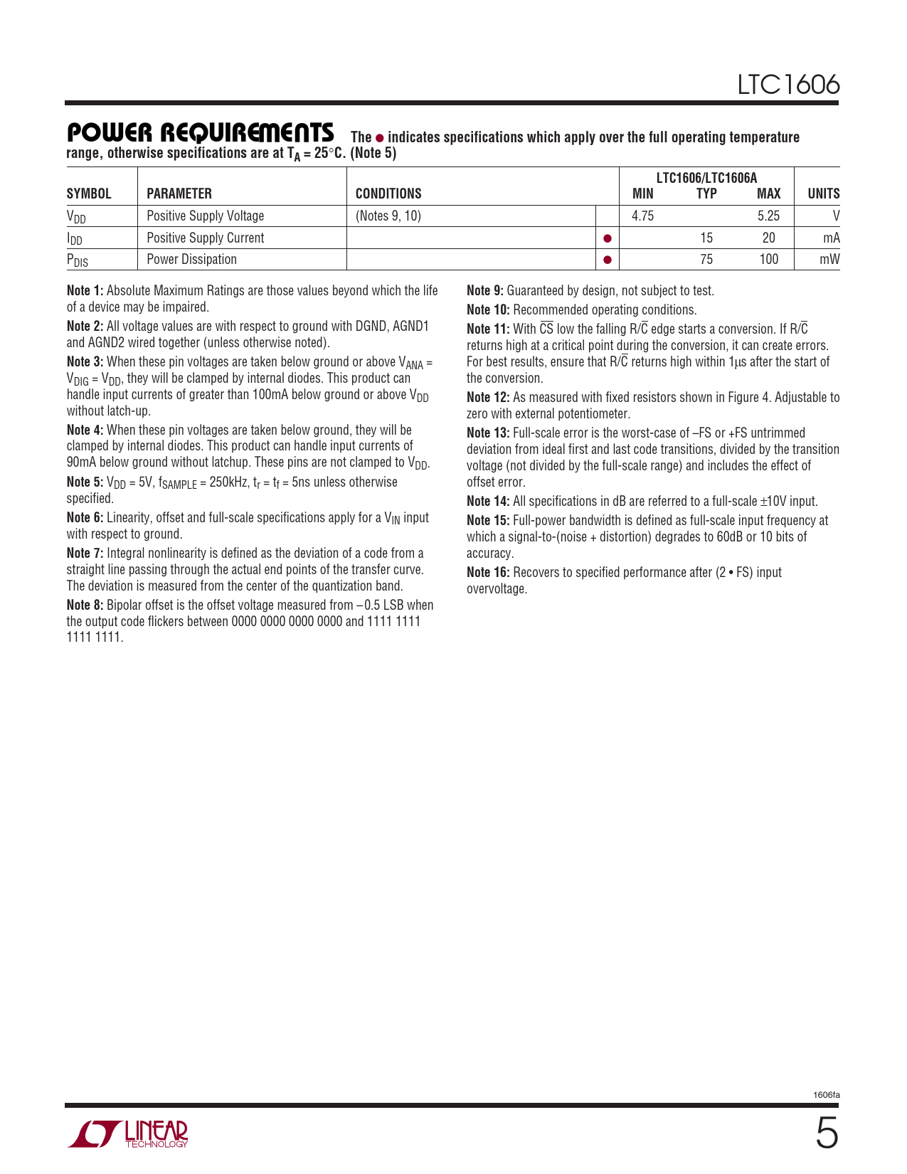 LTC1606 WUPOWER REQUIREMENTS The ● indicates specifications which apply over the full operating temperaturerange, otherwise specifications are at TA = 25 ° C. (Note 5)LTC1606/LTC1606ASYMBOLPARAMETERCONDITIONSMINTYPMAXUNITS VDD Positive Supply Voltage (Notes 9, 10) 4.75 5.25 V IDD Positive Supply Current ● 15 20 mA PDIS Power Dissipation ● 75 100 mW Note 1: Absolute Maximum Ratings are those values beyond which the life Note 9: Guaranteed by design, not subject to test. of a device may be impaired. Note 10: Recommended operating conditions. Note 2: All voltage values are with respect to ground with DGND, AGND1 Note 11: With CS low the falling R/C edge starts a conversion. If R/C and AGND2 wired together (unless otherwise noted). returns high at a critical point during the conversion, it can create errors. Note 3: When these pin voltages are taken below ground or above VANA = For best results, ensure that R/C returns high within 1µs after the start of VDIG = VDD, they will be clamped by internal diodes. This product can the conversion. handle input currents of greater than 100mA below ground or above VDD Note 12: As measured with fixed resistors shown in Figure 4. Adjustable to without latch-up. zero with external potentiometer. Note 4: When these pin voltages are taken below ground, they will be Note 13: Full-scale error is the worst-case of –FS or +FS untrimmed clamped by internal diodes. This product can handle input currents of deviation from ideal first and last code transitions, divided by the transition 90mA below ground without latchup. These pins are not clamped to VDD. voltage (not divided by the full-scale range) and includes the effect of Note 5: VDD = 5V, fSAMPLE = 250kHz, tr = tf = 5ns unless otherwise offset error. specified. Note 14: All specifications in dB are referred to a full-scale ±10V input. Note 6: Linearity, offset and full-scale specifications apply for a VIN input Note 15: Full-power bandwidth is defined as full-scale input frequency at with respect to ground. which a signal-to-(noise + distortion) degrades to 60dB or 10 bits of Note 7: Integral nonlinearity is defined as the deviation of a code from a accuracy. straight line passing through the actual end points of the transfer curve. Note 16: Recovers to specified performance after (2 • FS) input The deviation is measured from the center of the quantization band. overvoltage. Note 8: Bipolar offset is the offset voltage measured from – 0.5 LSB when the output code flickers between 0000 0000 0000 0000 and 1111 1111 1111 1111. 1606fa 5
