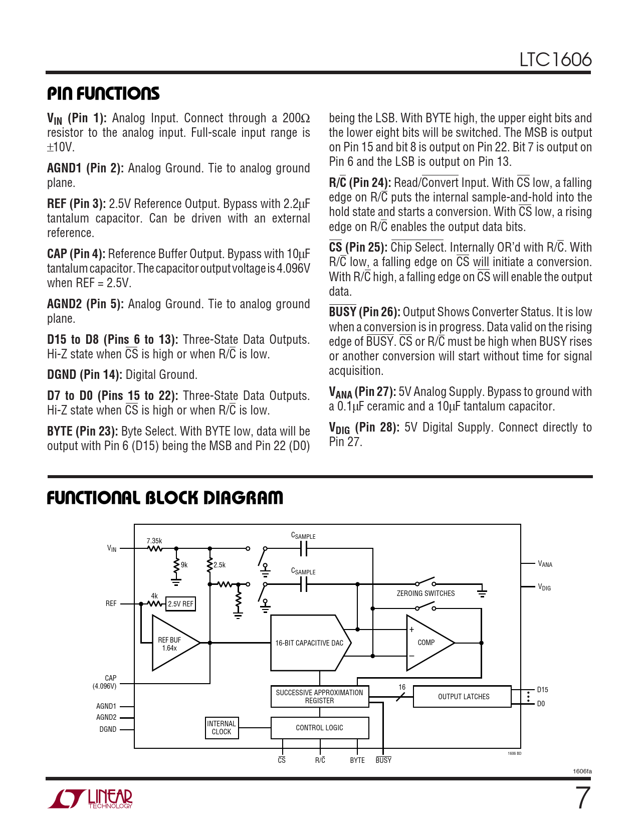 LTC1606 UUUPI FU CTIO SVIN (Pin 1): Analog Input. Connect through a 200Ω being the LSB. With BYTE high, the upper eight bits and resistor to the analog input. Full-scale input range is the lower eight bits will be switched. The MSB is output ±10V. on Pin 15 and bit 8 is output on Pin 22. Bit 7 is output on Pin 6 and the LSB is output on Pin 13. AGND1 (Pin 2): Analog Ground. Tie to analog ground plane. R/C (Pin 24): Read/Convert Input. With CS low, a falling edge on R/C puts the internal sample-and-hold into the REF (Pin 3): 2.5V Reference Output. Bypass with 2.2µF hold state and starts a conversion. With CS low, a rising tantalum capacitor. Can be driven with an external edge on R/C enables the output data bits. reference. CS (Pin 25): Chip Select. Internally OR’d with R/C. With CAP (Pin 4): Reference Buffer Output. Bypass with 10µF R/C low, a falling edge on CS will initiate a conversion. tantalum capacitor. The capacitor output voltage is 4.096V With R/C high, a falling edge on CS will enable the output when REF = 2.5V. data. AGND2 (Pin 5): Analog Ground. Tie to analog ground BUSY (Pin 26): Output Shows Converter Status. It is low plane. when a conversion is in progress. Data valid on the rising D15 to D8 (Pins 6 to 13): Three-State Data Outputs. edge of BUSY. CS or R/C must be high when BUSY rises Hi-Z state when CS is high or when R/C is low. or another conversion will start without time for signal DGND (Pin 14): Digital Ground. acquisition. D7 to D0 (Pins 15 to 22): Three-State Data Outputs. VANA (Pin 27): 5V Analog Supply. Bypass to ground with Hi-Z state when CS is high or when R/C is low. a 0.1µF ceramic and a 10µF tantalum capacitor. BYTE (Pin 23): Byte Select. With BYTE low, data will be VDIG (Pin 28): 5V Digital Supply. Connect directly to output with Pin 6 (D15) being the MSB and Pin 22 (D0) Pin 27. UUWFU CTIO AL BLOCK DIAGRA CSAMPLE 7.35k VIN V 9k 2.5k ANA CSAMPLE VDIG ZEROING SWITCHES 4k REF 2.5V REF + REF BUF 16-BIT CAPACITIVE DAC COMP 1.64x – CAP (4.096V) 16 SUCCESSIVE APPROXIMATION • D15 OUTPUT LATCHES • REGISTER • D0 AGND1 AGND2 INTERNAL CONTROL LOGIC DGND CLOCK 1606 BD CS R/C BYTE BUSY 1606fa 7