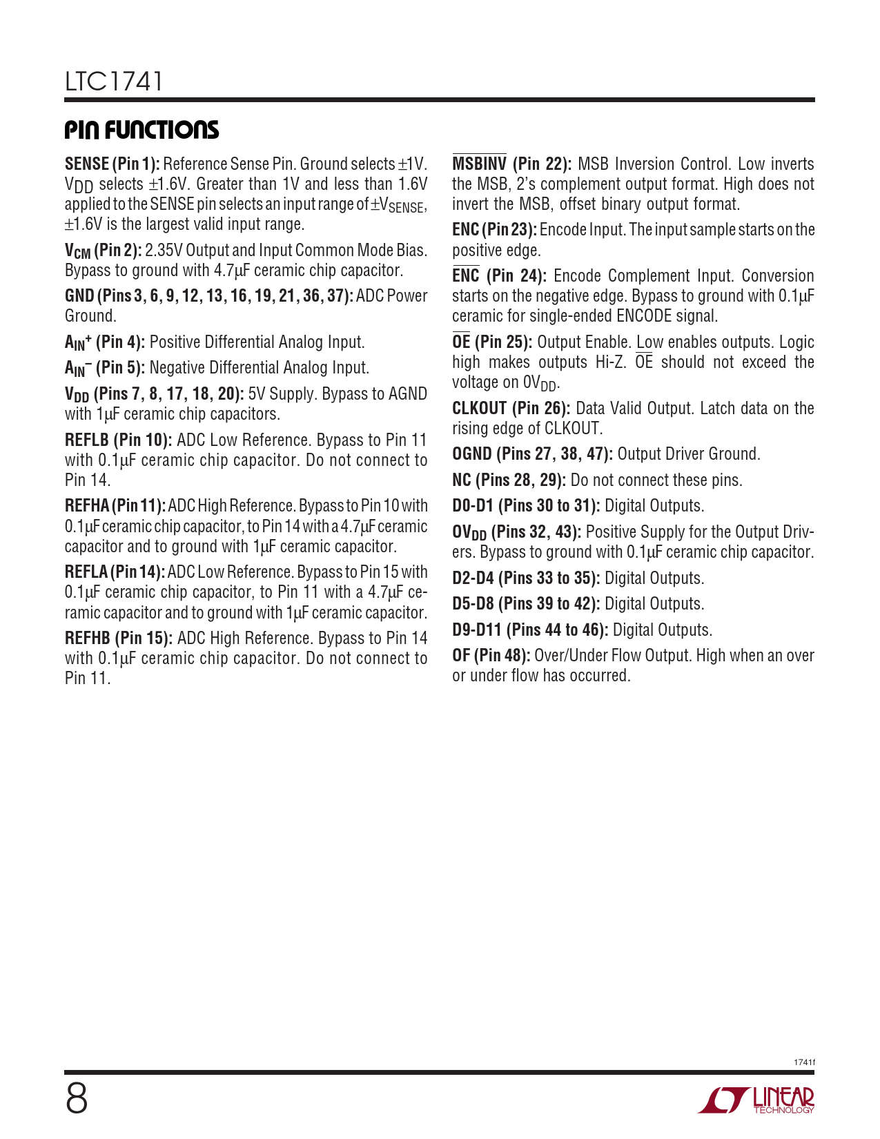 Over/Under Flow Output. High when an over Pin␣ 11. or under flow has occurred. 1741f 8