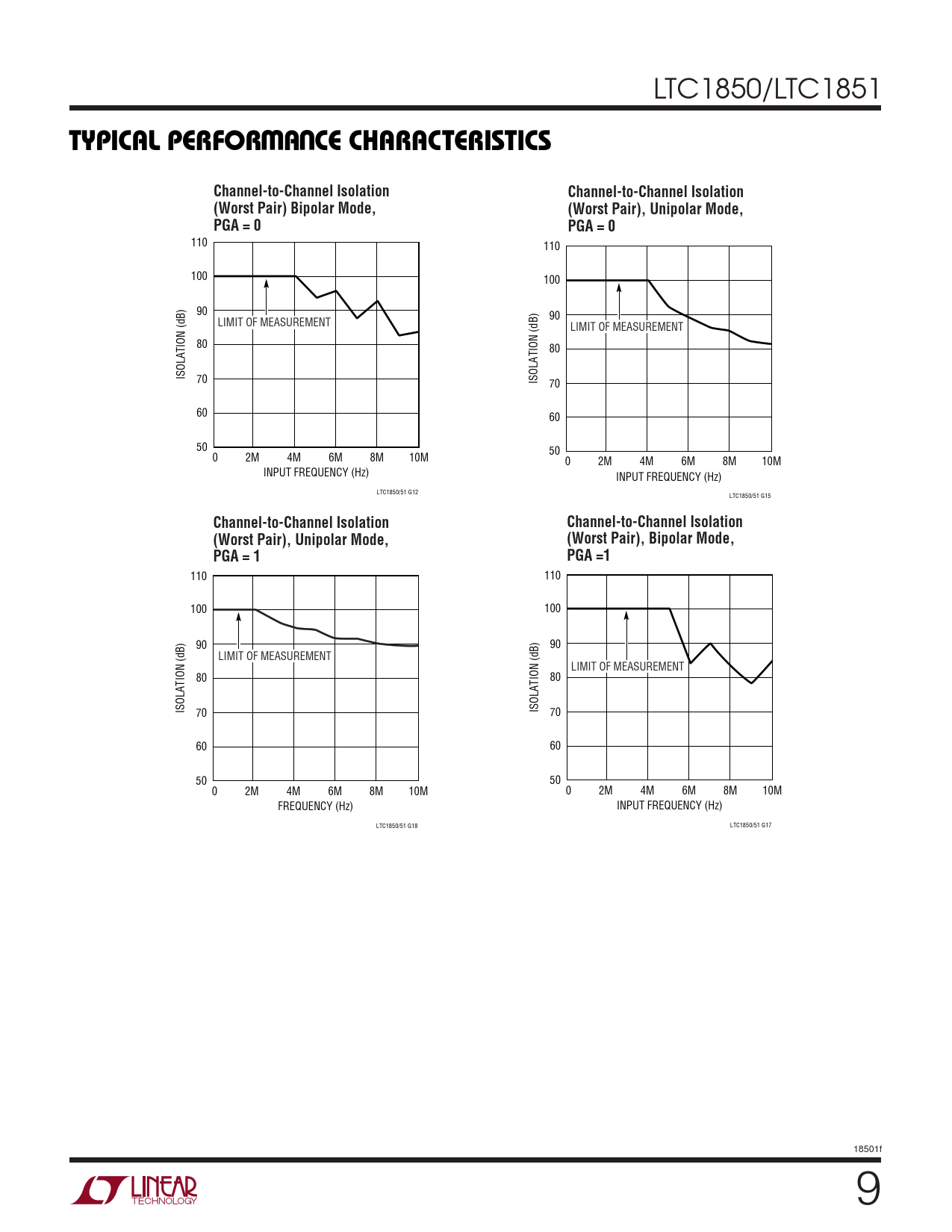 110 110 100 100 90 90 LIMIT OF MEASUREMENT LIMIT OF MEASUREMENT 80 80 ISOLATION (dB) ISOLATION (dB) 70 70 60 60 50 50 0 2M 4M 6M 8M 10M 0 2M 4M 6M 8M 10M FREQUENCY (Hz) INPUT FREQUENCY (Hz) LTC1850/51 G18 LTC1850/51 G17 18501f 9