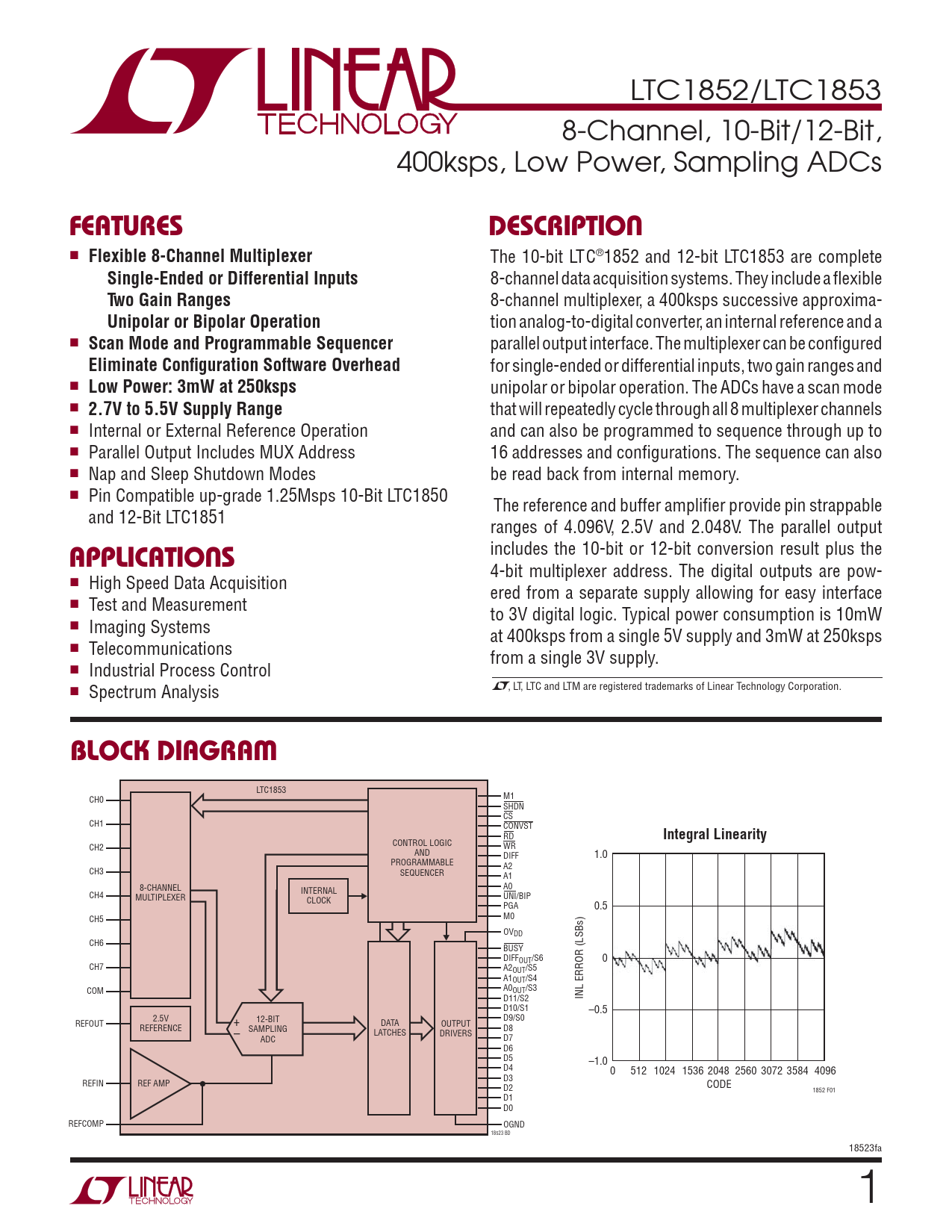 LTC1852/LTC1853 8-Channel, 10-Bit/12-Bit, 400ksps, Low Power, Sampling ADCs