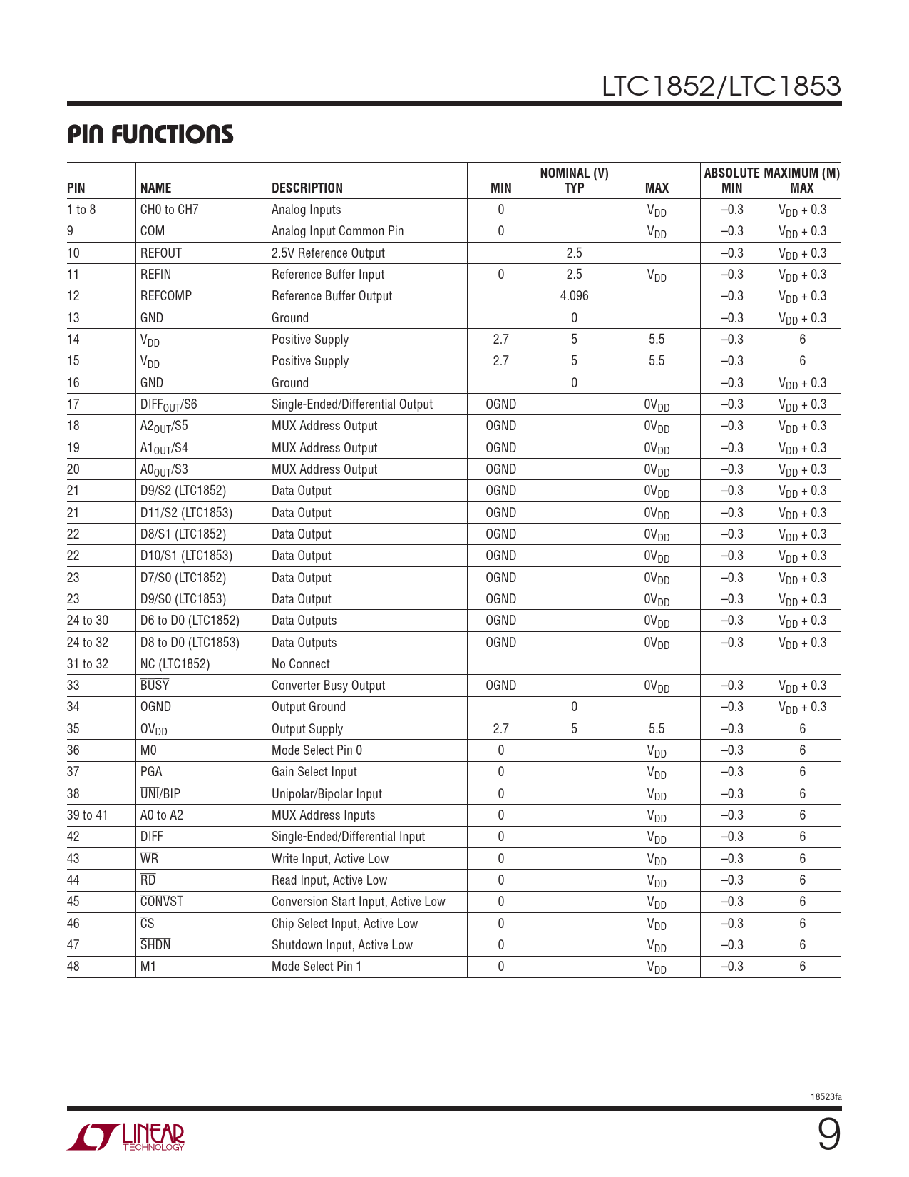 1 to 8 CH0 to CH7 Analog Inputs 0 VDD –0.3 VDD + 0.3 9 COM Analog Input Common Pin 0 VDD –0.3 VDD + 0.3 10 REFOUT 2.5V Reference Output 2.5 –0.3 VDD + 0.3 11 REFIN Reference Buffer Input 0 2.5 VDD –0.3 VDD + 0.3 12 REFCOMP Reference Buffer Output 4.096 –0.3 VDD + 0.3 13 GND Ground 0 –0.3 VDD + 0.3 14 VDD Positive Supply 2.7 5 5.5 –0.3 6 15 VDD Positive Supply 2.7 5 5.5 –0.3 6 16 GND Ground 0 –0.3 VDD + 0.3 17 DIFFOUT/S6 Single-Ended/Differential Output OGND 0VDD –0.3 VDD + 0.3 18 A2OUT/S5 MUX Address Output OGND 0VDD –0.3 VDD + 0.3 19 A1OUT/S4 MUX Address Output OGND 0VDD –0.3 VDD + 0.3 20 A0OUT/S3 MUX Address Output OGND 0VDD –0.3 VDD + 0.3 21 D9/S2 (LTC1852) Data Output OGND 0VDD –0.3 VDD + 0.3 21 D11/S2 (LTC1853) Data Output OGND 0VDD –0.3 VDD + 0.3 22 D8/S1 (LTC1852) Data Output OGND 0VDD –0.3 VDD + 0.3 22 D10/S1 (LTC1853) Data Output OGND 0VDD –0.3 VDD + 0.3 23 D7/S0 (LTC1852) Data Output OGND 0VDD –0.3 VDD + 0.3 23 D9/S0 (LTC1853) Data Output OGND 0VDD –0.3 VDD + 0.3 24 to 30 D6 to D0 (LTC1852) Data Outputs OGND 0VDD –0.3 VDD + 0.3 24 to 32 D8 to D0 (LTC1853) Data Outputs OGND 0VDD –0.3 VDD + 0.3 31 to 32 NC (LTC1852) No Connect 33 BUSY Converter Busy Output OGND 0VDD –0.3 VDD + 0.3 34 OGND Output Ground 0 –0.3 VDD + 0.3 35 OVDD Output Supply 2.7 5 5.5 –0.3 6 36 M0 Mode Select Pin 0 0 VDD –0.3 6 37 PGA Gain Select Input 0 VDD –0.3 6 38 UNI/BIP Unipolar/Bipolar Input 0 VDD –0.3 6 39 to 41 A0 to A2 MUX Address Inputs 0 VDD –0.3 6 42 DIFF Single-Ended/Differential Input 0 VDD –0.3 6 43 WR Write Input, Active Low 0 VDD –0.3 6 44 RD Read Input, Active Low 0 VDD –0.3 6 45 CONVST Conversion Start Input, Active Low 0 VDD –0.3 6 46 CS Chip Select Input, Active Low 0 VDD –0.3 6 47 SHDN Shutdown Input, Active Low 0 VDD –0.3 6 48 M1 Mode Select Pin 1 0 VDD –0.3 6 18523fa 9