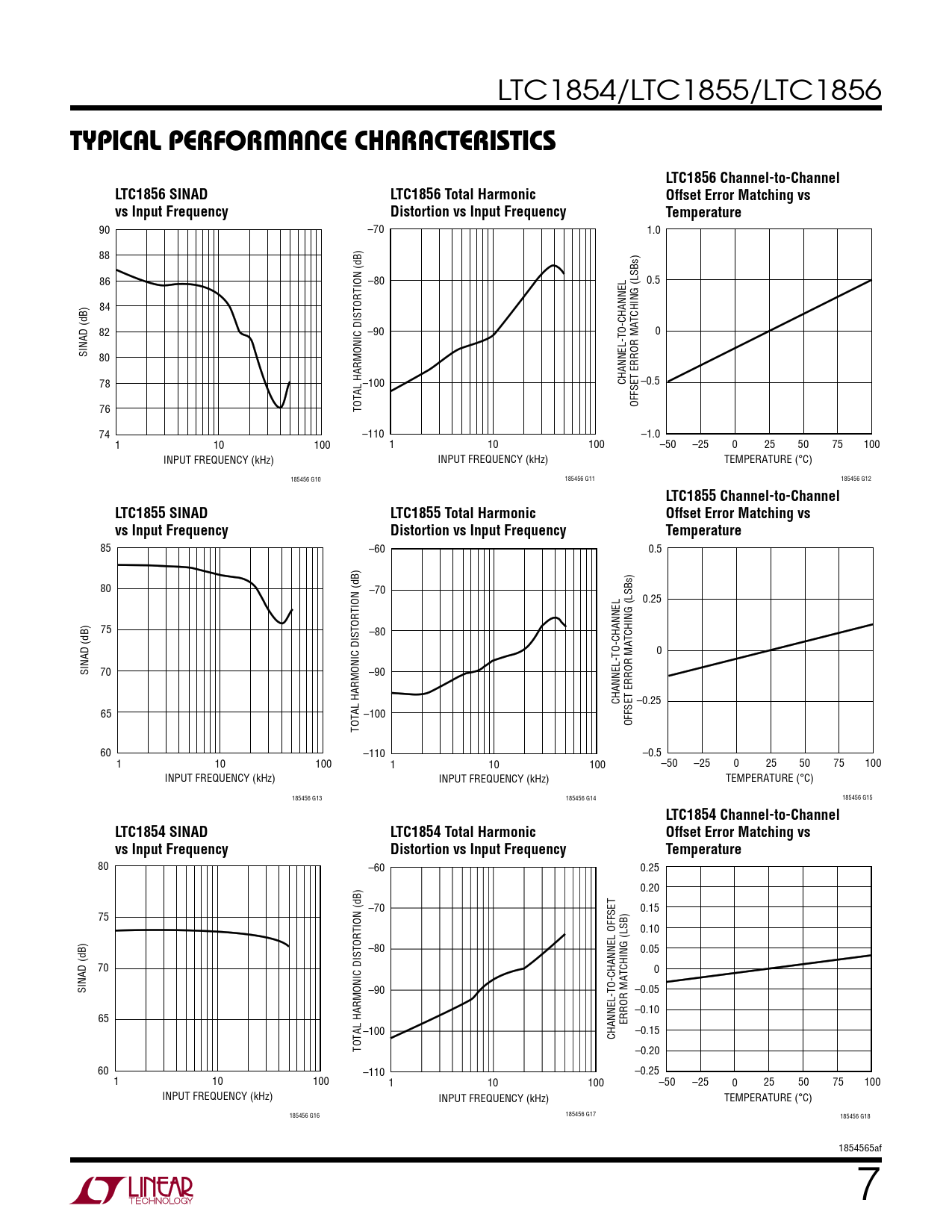 LTC1854 Channel-to-Channel LTC1854 SINAD LTC1854 Total Harmonic Offset Error Matching vs vs Input Frequency Distortion vs Input Frequency Temperature