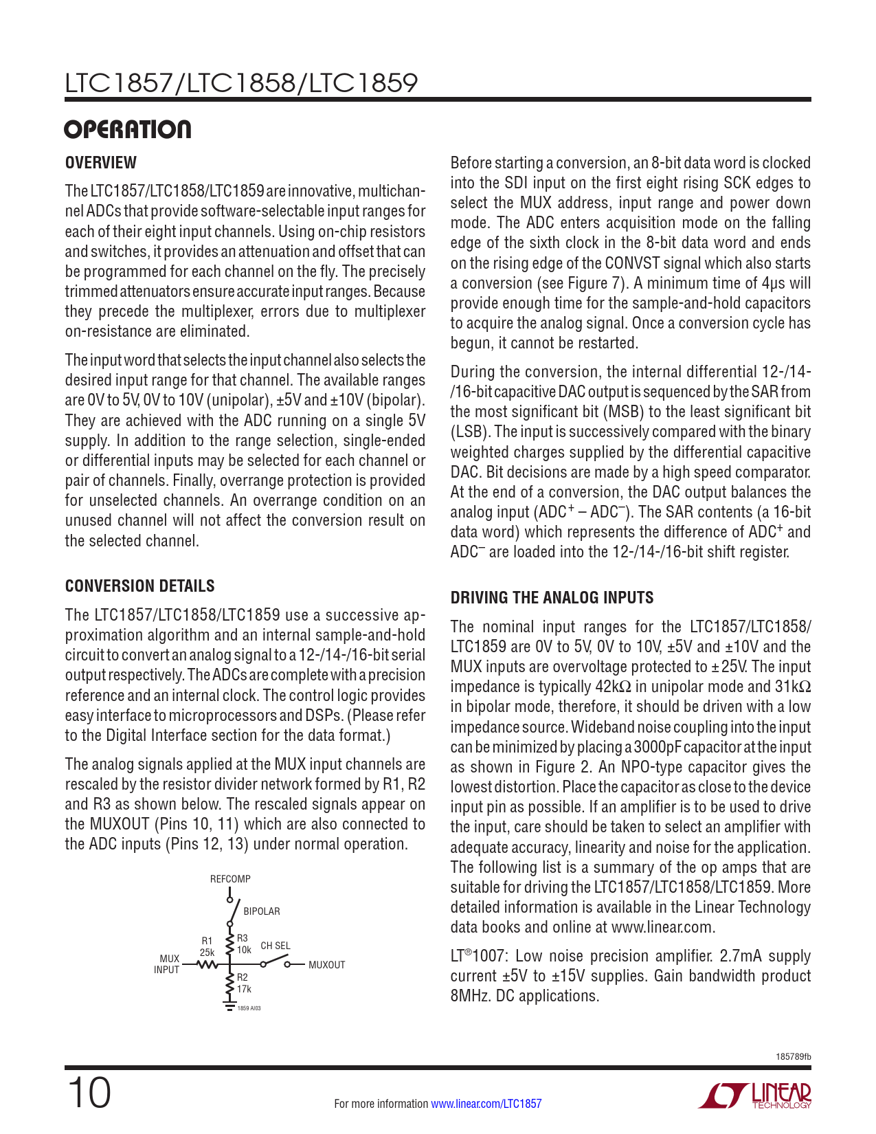 Páginas / Página22 / 10 — OPERATION. OVERVIEW. CONVERSION DETAILS. DRIVING THE ANALOG INPUTS