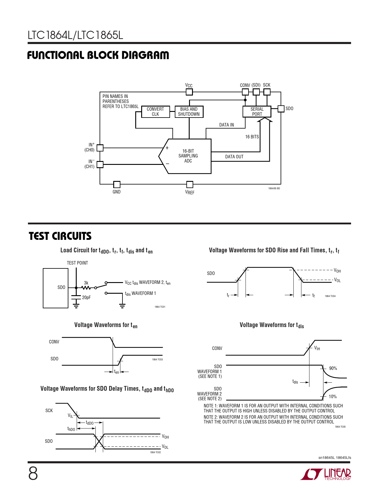 SDO WAVEFORM 2 10% (SEE NOTE 2) NOTE 1: WAVEFORM 1 IS FOR AN OUTPUT WITH INTERNAL CONDITIONS SUCH SCK THAT THE OUTPUT IS HIGH UNLESS DISABLED BY THE OUTPUT CONTROL VIL NOTE 2: WAVEFORM 2 IS FOR AN OUTPUT WITH INTERNAL CONDITIONS SUCH tdDO THAT THE OUTPUT IS LOW UNLESS DISABLED BY THE OUTPUT CONTROL t 1864 TC05 hDO VOH SDO VOL 1864 TC02 sn18645L 18645Lfs 8