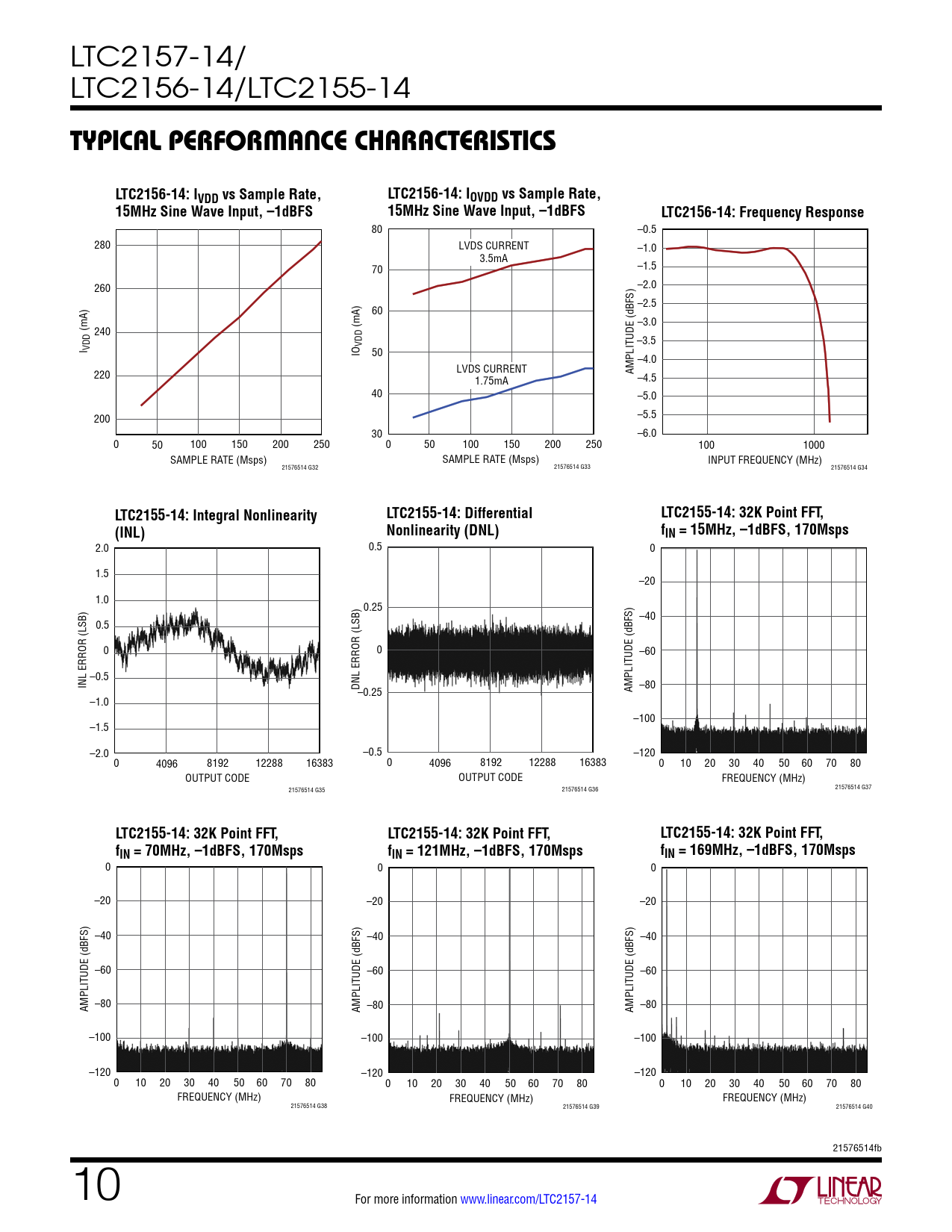 LTC2155-14: Integral Nonlinearity LTC2155-14: Differential LTC2155-14: 32K Point FFT, (INL) Nonlinearity (DNL) fIN = 15MHz, –1dBFS, 170Msps