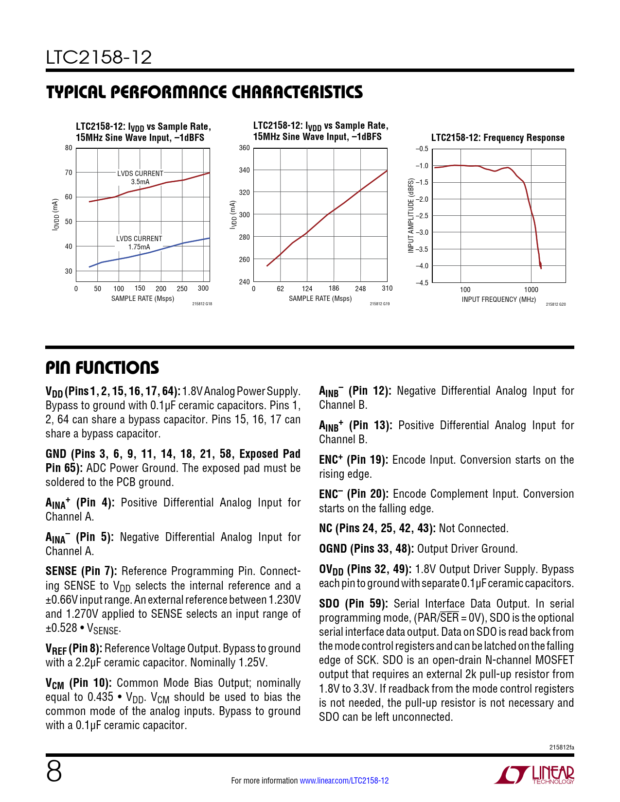 TYPICAL PERFORMANCE CHARACTERISTICS LTC2158-12: I LTC2158-12: I VDD vs Sample Rate, VDD vs Sample Rate, 15MHz Sine Wave Input, –1dBFS 15MHz Sine Wave Input, –1dBFS LTC2158-12: Frequency Response