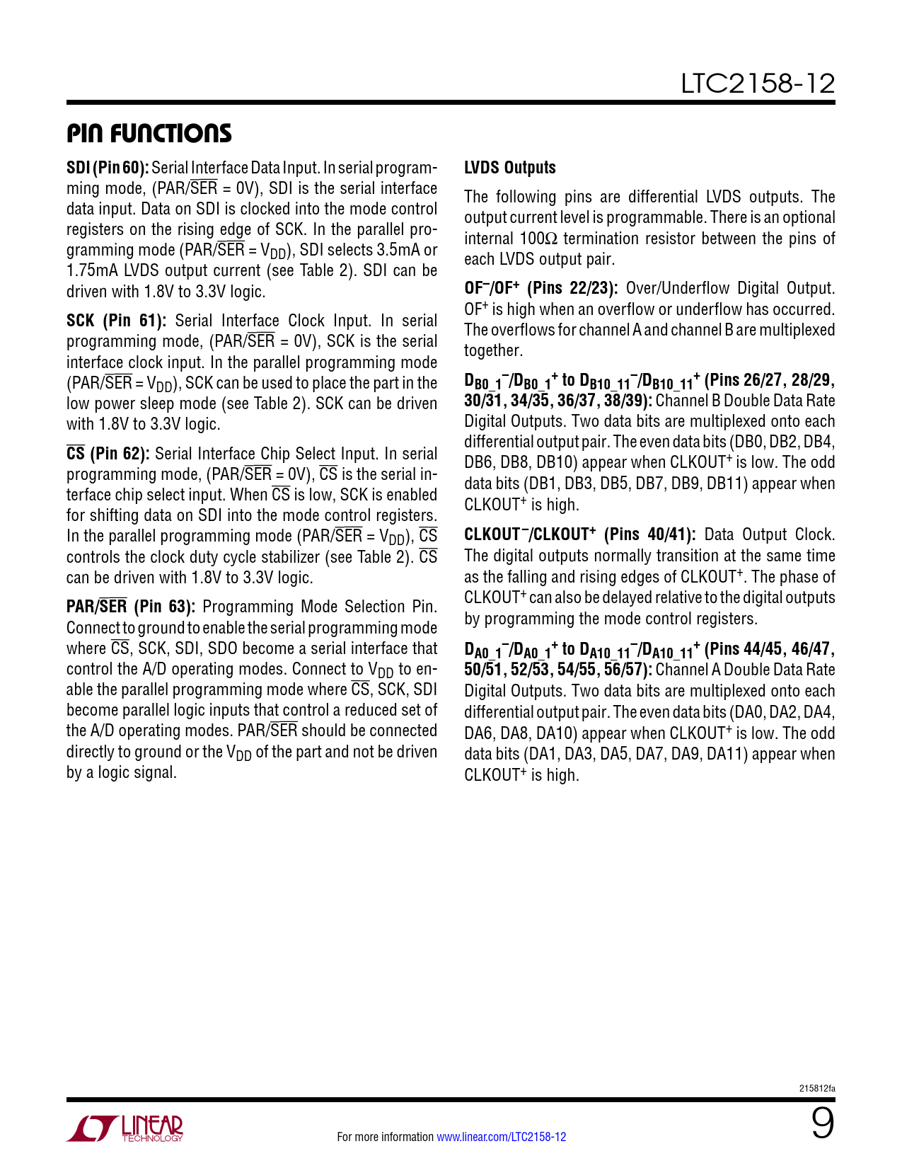 PIN FUNCTIONS SDI (Pin 60):. LVDS Outputs. OF–/OF+ (Pins 22/23):. SCK (Pin 61):