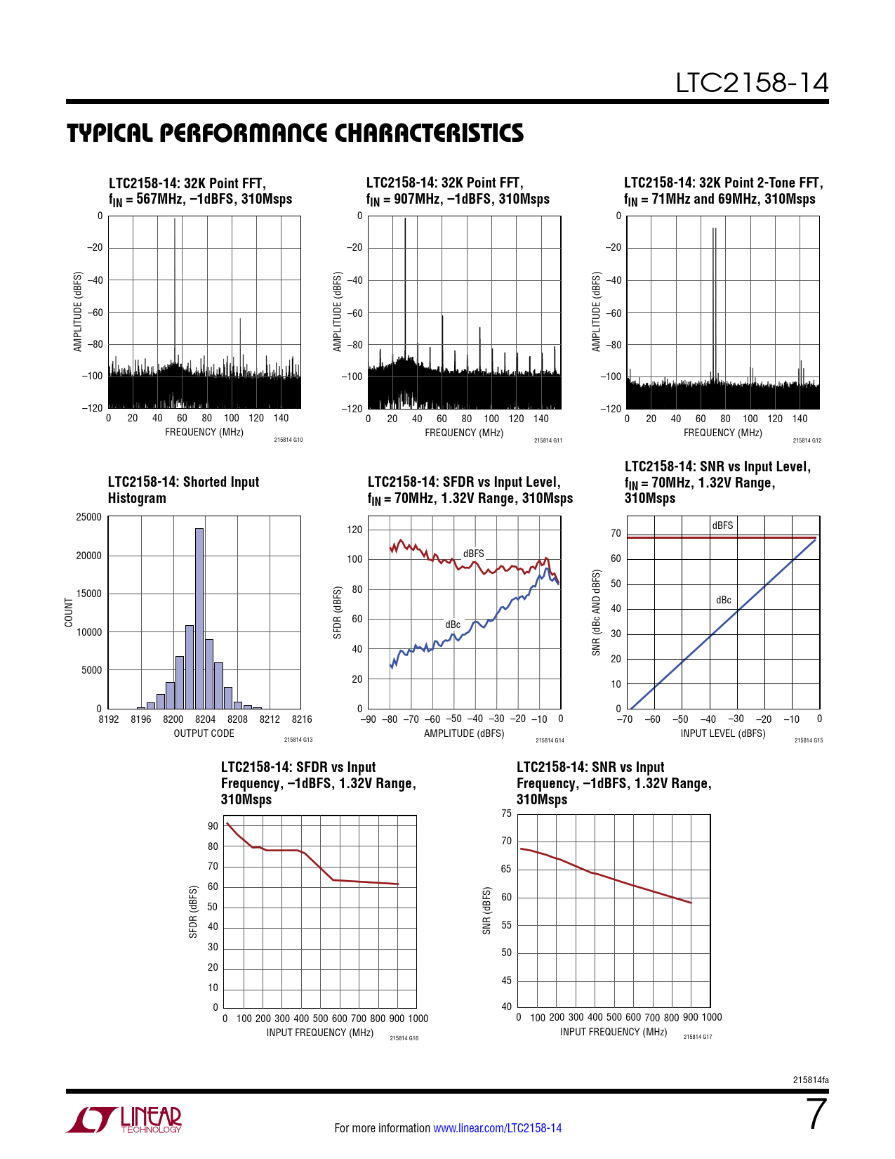 LTC2158-14: SNR vs Input Level, LTC2158-14: Shorted Input LTC2158-14: SFDR vs Input Level, fIN = 70MHz, 1.32V Range, Histogram fIN = 70MHz, 1.32V Range, 310Msps 310Msps