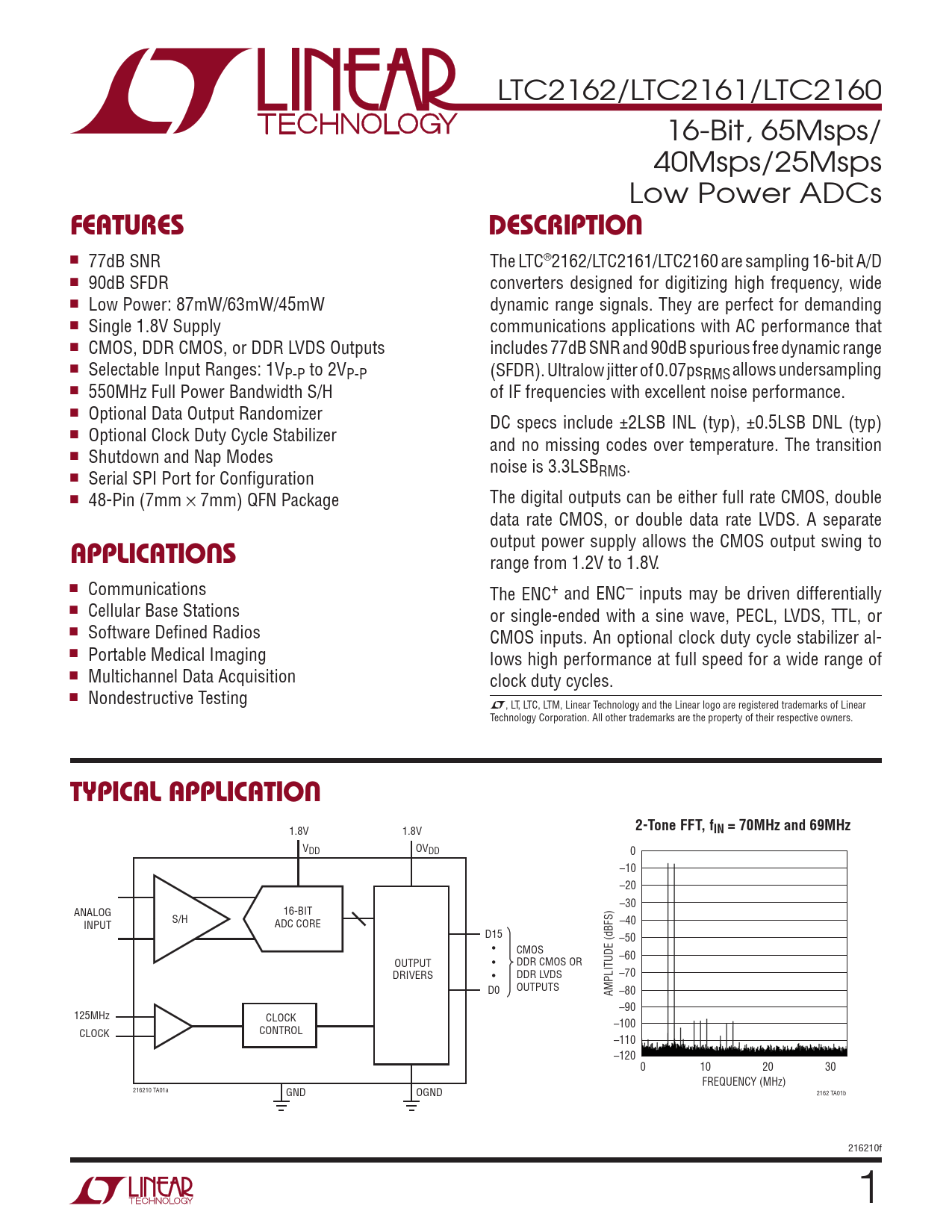LTC2162/LTC2161/LTC2160 16-Bit, 65Msps/ 40Msps/25Msps Low Power ADCs FeaTuresDescripTion n 77dB SNR The LTC®2162/LTC2161/LTC2160 are sampling 16-bit A/D n 90dB SFDR converters designed for digitizing high frequency, wide n Low Power: 87mW/63mW/45mW dynamic range signals. They are perfect for demanding n Single 1.8V Supply communications applications with AC performance that n CMOS, DDR CMOS, or DDR LVDS Outputs includes 77dB SNR and 90dB spurious free dynamic range n Selectable Input Ranges: 1VP-P to 2VP-P (SFDR). Ultralow jitter of 0.07psRMS al ows undersampling n 550MHz Full Power Bandwidth S/H of IF frequencies with excellent noise performance. n Optional Data Output Randomizer DC specs include ±2LSB INL (typ), ±0.5LSB DNL (typ) n Optional Clock Duty Cycle Stabilizer and no missing codes over temperature. The transition n Shutdown and Nap Modes noise is 3.3LSBRMS. n Serial SPI Port for Configuration n 48-Pin (7mm × 7mm) QFN Package The digital outputs can be either full rate CMOS, double data rate CMOS, or double data rate LVDS. A separate output power supply allows the CMOS output swing to applicaTions range from 1.2V to 1.8V. n Communications The ENC+ and ENC– inputs may be driven differentially n Cellular Base Stations or single-ended with a sine wave, PECL, LVDS, TTL, or n Software Defined Radios CMOS inputs. An optional clock duty cycle stabilizer al- n Portable Medical Imaging lows high performance at full speed for a wide range of n Multichannel Data Acquisition clock duty cycles. n Nondestructive Testing L, LT, LTC, LTM, Linear Technology and the Linear logo are registered trademarks of Linear Technology Corporation. All other trademarks are the property of their respective owners. Typical applicaTion2-Tone FFT, f 1.8V 1.8V IN = 70MHz and 69MHz VDD OVDD 0 –10 –20 –30 ANALOG 16-BIT S/H INPUT ADC CORE –40 D15 –50 • CMOS –60 OUTPUT • DDR CMOS OR DRIVERS DDR LVDS –70 • D0 OUTPUTS AMPLITUDE (dBFS) –80 –90 125MHz CLOCK –100 CONTROL CLOCK –110 –120 0 10 20 30 FREQUENCY (MHz) 216210 TA01a GND OGND 2162 TA01b 216210f 1 Document Outline Features Applications Description Typical Application Absolute Maximum Ratings Pin Configuration Order Information Converter Characteristics Analog input Dynamic Accuracy Internal Reference Characteristics Digital Inputs and Outputs Power Requirements Timing Characteristics Electrical Characteristics Timing Diagrams Typical Performance Characteristics Pin Functions Functional Block Diagram Applications Information Typical Applications Package Description Typical Application Related Parts