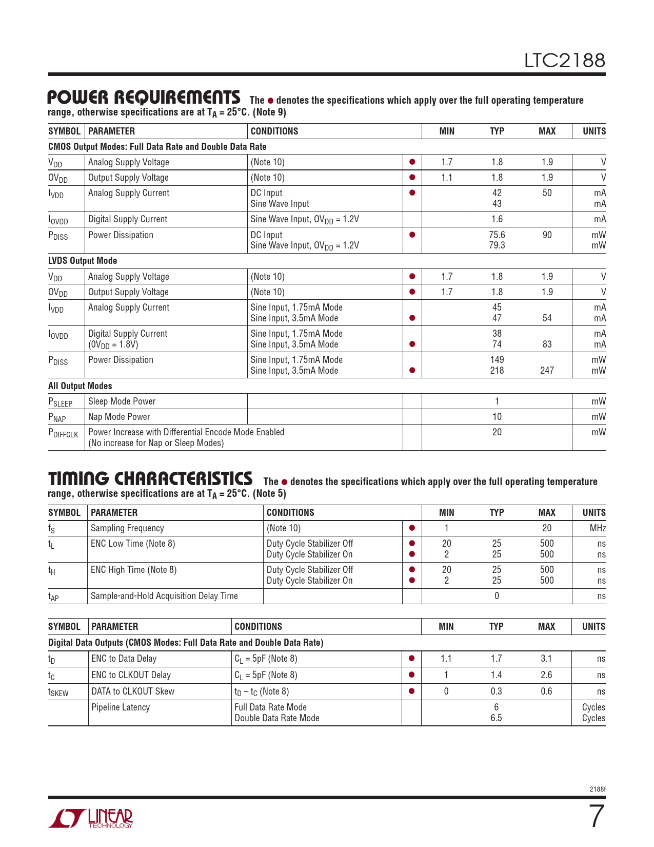 LTC2188 power requireMenTsThe l denotes the specifications which apply over the full operating temperaturerange, otherwise specifications are at TA = 25°C. (Note 9)SYMBOL PARAMETERCONDITIONSMINTYPMAXUNITSCMOS Output Modes: Full Data Rate and Double Data Rate VDD Analog Supply Voltage (Note 10) l 1.7 1.8 1.9 V OVDD Output Supply Voltage (Note 10) l 1.1 1.8 1.9 V IVDD Analog Supply Current DC Input l 42 50 mA Sine Wave Input 43 mA IOVDD Digital Supply Current Sine Wave Input, OVDD = 1.2V 1.6 mA PDISS Power Dissipation DC Input l 75.6 90 mW Sine Wave Input, OVDD = 1.2V 79.3 mW LVDS Output Mode VDD Analog Supply Voltage (Note 10) l 1.7 1.8 1.9 V OVDD Output Supply Voltage (Note 10) l 1.7 1.8 1.9 V IVDD Analog Supply Current Sine Input, 1.75mA Mode 45 mA Sine Input, 3.5mA Mode l 47 54 mA IOVDD Digital Supply Current Sine Input, 1.75mA Mode 38 mA (0VDD = 1.8V) Sine Input, 3.5mA Mode l 74 83 mA PDISS Power Dissipation Sine Input, 1.75mA Mode 149 mW Sine Input, 3.5mA Mode l 218 247 mW All Output Modes PSLEEP Sleep Mode Power 1 mW PNAP Nap Mode Power 10 mW PDIFFCLK Power Increase with Differential Encode Mode Enabled 20 mW (No increase for Nap or Sleep Modes) TiMing characTerisTicsThe l denotes the specifications which apply over the full operating temperaturerange, otherwise specifications are at TA = 25°C. (Note 5)SYMBOL PARAMETERCONDITIONSMINTYPMAXUNITS fS Sampling Frequency (Note 10) l 1 20 MHz tL ENC Low Time (Note 8) Duty Cycle Stabilizer Off l 20 25 500 ns Duty Cycle Stabilizer On l 2 25 500 ns tH ENC High Time (Note 8) Duty Cycle Stabilizer Off l 20 25 500 ns Duty Cycle Stabilizer On l 2 25 500 ns tAP Sample-and-Hold Acquisition Delay Time 0 ns SYMBOL PARAMETERCONDITIONSMINTYPMAXUNITSDigital Data Outputs (CMOS Modes: Full Data Rate and Double Data Rate) tD ENC to Data Delay CL = 5pF (Note 8) l 1.1 1.7 3.1 ns tC ENC to CLKOUT Delay CL = 5pF (Note 8) l 1 1.4 2.6 ns tSKEW DATA to CLKOUT Skew tD – tC (Note 8) l 0 0.3 0.6 ns Pipeline Latency Full Data Rate Mode 6 Cycles Double Data Rate Mode 6.5 Cycles 2188f 7 Document Outline Features Applications Description Typical Application Absolute Maximum Ratings Pin Configurations Order Information Converter Characteristics Analog Input Dynamic Accuracy Internal Reference Characteristics Digital Inputs and Outputs Power Requirements Timing Characteristics Timing Diagrams Typical Performance Characteristics Pin Functions Functional Block Diagram Applications Information Typical Applications Package Description Typical Application Related Parts