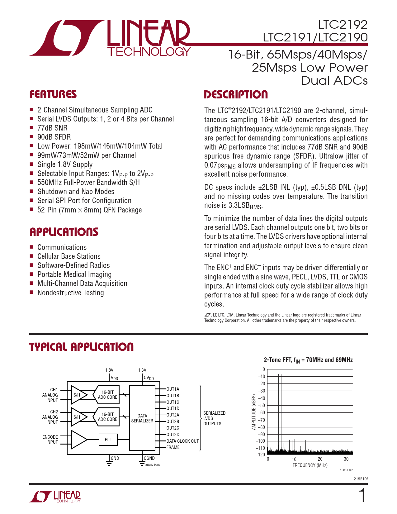 LTC2192 LTC2191/LTC2190 16-Bit, 65Msps/40Msps/ 25Msps Low Power Dual ADCs FEATURESDESCRIPTION n 2-Channel Simultaneous Sampling ADC The LTC®2192/LTC2191/LTC2190 are 2-channel, simul- n Serial LVDS Outputs: 1, 2 or 4 Bits per Channel taneous sampling 16-bit A/D converters designed for n 77dB SNR digitizing high frequency, wide dynamic range signals. They n 90dB SFDR are perfect for demanding communications applications n Low Power: 198mW/146mW/104mW Total with AC performance that includes 77dB SNR and 90dB n 99mW/73mW/52mW per Channel spurious free dynamic range (SFDR). Ultralow jitter of n Single 1.8V Supply 0.07psRMS allows undersampling of IF frequencies with n Selectable Input Ranges: 1VP-P to 2VP-P excellent noise performance. n 550MHz Full-Power Bandwidth S/H DC specs include ±2LSB INL (typ), ±0.5LSB DNL (typ) n Shutdown and Nap Modes and no missing codes over temperature. The transition n Serial SPI Port for Configuration noise is 3.3LSB n RMS. 52-Pin (7mm × 8mm) QFN Package To minimize the number of data lines the digital outputs APPLICATIONS are serial LVDS. Each channel outputs one bit, two bits or four bits at a time. The LVDS drivers have optional internal n Communications termination and adjustable output levels to ensure clean n Cellular Base Stations signal integrity. n Software-Defined Radios The ENC+ and ENC– inputs may be driven differentially or n Portable Medical Imaging single ended with a sine wave, PECL, LVDS, TTL or CMOS n Multi-Channel Data Acquisition inputs. An internal clock duty cycle stabilizer allows high n Nondestructive Testing performance at full speed for a wide range of clock duty cycles. L, LT, LTC, LTM, Linear Technology and the Linear logo are registered trademarks of Linear Technology Corporation. All other trademarks are the property of their respective owners. TYPICAL APPLICATION2-Tone FFT, fIN = 70MHz and 69MHz 1.8V 1.8V 0 VDD OVDD –10 –20 CH1 OUT1A 16-BIT –30 ANALOG S/H ADC CORE OUT1B INPUT –40 OUT1C –50 OUT1D CH2 SERIALIZED –60 ANALOG 16-BIT OUT2A S/H DATA LVDS INPUT ADC CORE SERIALIZER OUT2B –70 OUTPUTS OUT2C AMPLITUDE (dBFS) –80 ENCODE OUT2D –90 INPUT PLL DATA CLOCK OUT –100 FRAME –110 –120 GND OGND 0 10 20 30 219210 TA01a FREQUENCY (MHz) 219210 G07 219210f 1 Document Outline Features Applications Description Typical Application Absolute Maximum Ratings Pin Configuration Order Information Converter Characteristics Analog Input Dynamic Accuracy Internal Reference Characteristics Digital Inputs And Outputs Power Requirements Timing Characteristics Timing Diagrams Typical Performance Characteristics Pin Functions Functional Block Diagram Applications Information Typical Applications Package Description Typical Application Related Parts