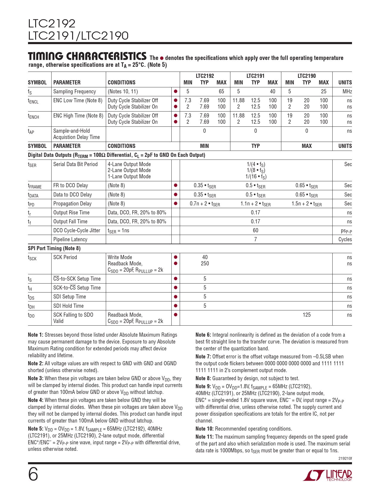 LTC2192 LTC2191/LTC2190 TIMING CHARACTERISTICSThe l denotes the specifications which apply over the full operating temperaturerange, otherwise specifications are at TA = 25°C. (Note 5)LTC2192LTC2191LTC2190SYMBOL PARAMETERCONDITIONSMINTYPMAXMINTYPMAXMINTYPMAXUNITS fS Sampling Frequency (Notes 10, 11) l 5 65 5 40 5 25 MHz tENCL ENC Low Time (Note 8) Duty Cycle Stabilizer Off l 7.3 7.69 100 11.88 12.5 100 19 20 100 ns Duty Cycle Stabilizer On l 2 7.69 100 2 12.5 100 2 20 100 ns tENCH ENC High Time (Note 8) Duty Cycle Stabilizer Off l 7.3 7.69 100 11.88 12.5 100 19 20 100 ns Duty Cycle Stabilizer On l 2 7.69 100 2 12.5 100 2 20 100 ns tAP Sample-and-Hold 0 0 0 ns Acquistion Delay Time SYMBOL PARAMETERCONDITIONSMINTYPMAXUNITSDigital Data Outputs (RTERM = 100Ω Differential, CL = 2pF to GND On Each Output) tSER Serial Data Bit Period 4-Lane Output Mode 1/(4 • fS) Sec 2-Lane Output Mode 1/(8 • fS) 1-Lane Output Mode 1/(16 • fS) tFRAME FR to DCO Delay (Note 8) l 0.35 • tSER 0.5 • tSER 0.65 • tSER Sec tDATA Data to DCO Delay (Note 8) l 0.35 • tSER 0.5 • tSER 0.65 • tSER Sec tPD Propagation Delay (Note 8) l 0.7n + 2 • tSER 1.1n + 2 • tSER 1.5n + 2 • tSER Sec tr Output Rise Time Data, DCO, FR, 20% to 80% 0.17 ns tf Output Fall Time Data, DCO, FR, 20% to 80% 0.17 ns DCO Cycle-Cycle Jitter tSER = 1ns 60 psP-P Pipeline Latency 7 Cycles SPI Port Timing (Note 8) tSCK SCK Period Write Mode l 40 ns Readback Mode, l 250 ns CSDO = 20pF, RPULLUP = 2k tS CS-to-SCK Setup Time l 5 ns tH SCK-to-CS Setup Time l 5 ns tDS SDI Setup Time l 5 ns tDH SDI Hold Time l 5 ns tDO SCK Falling to SDO Readback Mode, l 125 ns Valid CSDO = 20pF, RPULLUP = 2k Note 1: Stresses beyond those listed under Absolute Maximum Ratings Note 6: Integral nonlinearity is defined as the deviation of a code from a may cause permanent damage to the device. Exposure to any Absolute best fit straight line to the transfer curve. The deviation is measured from Maximum Rating condition for extended periods may affect device the center of the quantization band. reliability and lifetime. Note 7: Offset error is the offset voltage measured from –0.5LSB when Note 2: All voltage values are with respect to GND with GND and OGND the output code flickers between 0000 0000 0000 0000 and 1111 1111 shorted (unless otherwise noted). 1111 1111 in 2’s complement output mode. Note 3: When these pin voltages are taken below GND or above VDD, they Note 8: Guaranteed by design, not subject to test. will be clamped by internal diodes. This product can handle input currents Note 9: VDD = OVDD=1.8V, fSAMPLE = 65MHz (LTC2192), of greater than 100mA below GND or above VDD without latchup. 40MHz (LTC2191), or 25MHz (LTC2190), 2-lane output mode, Note 4: When these pin voltages are taken below GND they will be ENC+ = single-ended 1.8V square wave, ENC– = 0V, input range = 2VP-P clamped by internal diodes. When these pin voltages are taken above VDD with differential drive, unless otherwise noted. The supply current and they will not be clamped by internal diodes. This product can handle input power dissipation specifications are totals for the entire IC, not per currents of greater than 100mA below GND without latchup. channel. Note 5: VDD = OVDD = 1.8V, fSAMPLE = 65MHz (LTC2192), 40MHz Note 10: Recommended operating conditions. (LTC2191), or 25MHz (LTC2190), 2-lane output mode, differential Note 11: The maximum sampling frequency depends on the speed grade ENC+/ENC– = 2VP-P sine wave, input range = 2VP-P with differential drive, of the part and also which serialization mode is used. The maximum serial unless otherwise noted. data rate is 1000Mbps, so tSER must be greater than or equal to 1ns. 219210f 6 Document Outline Features Applications Description Typical Application Absolute Maximum Ratings Pin Configuration Order Information Converter Characteristics Analog Input Dynamic Accuracy Internal Reference Characteristics Digital Inputs And Outputs Power Requirements Timing Characteristics Timing Diagrams Typical Performance Characteristics Pin Functions Functional Block Diagram Applications Information Typical Applications Package Description Typical Application Related Parts
