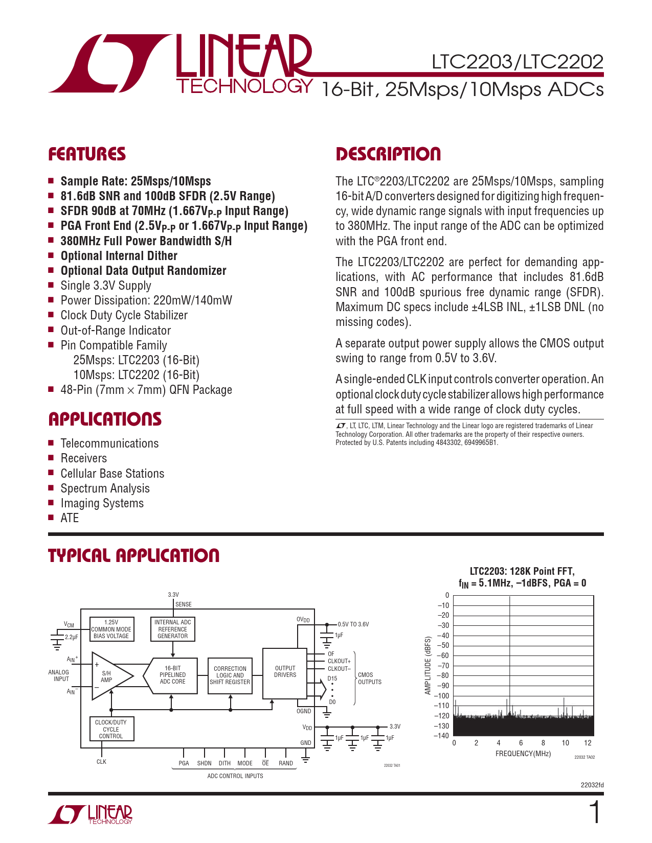 LTC2203/LTC2202 16-Bit, 25Msps/10Msps ADCs FEATURESDESCRIPTION n Sample Rate: 25Msps/10Msps The LTC®2203/LTC2202 are 25Msps/10Msps, sampling n 81.6dB SNR and 100dB SFDR (2.5V Range) 16-bit A/D converters designed for digitizing high frequen- n SFDR 90dB at 70MHz (1.667VP-P Input Range) cy, wide dynamic range signals with input frequencies up n PGA Front End (2.5VP-P or 1.667VP-P Input Range) to 380MHz. The input range of the ADC can be optimized n 380MHz Full Power Bandwidth S/H with the PGA front end. n Optional Internal Dither The LTC2203/LTC2202 are perfect for demanding app- n Optional Data Output Randomizer lications, with AC performance that includes 81.6dB n Single 3.3V Supply SNR and 100dB spurious free dynamic range (SFDR). n Power Dissipation: 220mW/140mW Maximum DC specs include ±4LSB INL, ±1LSB DNL (no n Clock Duty Cycle Stabilizer missing codes). n Out-of-Range Indicator n Pin Compatible Family A separate output power supply allows the CMOS output 25Msps: LTC2203 (16-Bit) swing to range from 0.5V to 3.6V. 10Msps: LTC2202 (16-Bit) A single-ended CLK input controls converter operation. An n 48-Pin (7mm × 7mm) QFN Package optional clock duty cycle stabilizer allows high performance at full speed with a wide range of clock duty cycles. APPLICATIONS L, LT, LTC, LTM, Linear Technology and the Linear logo are registered trademarks of Linear Technology Corporation. All other trademarks are the property of their respective owners. n Protected by U.S. Patents including 4843302, 6949965B1. Telecommunications n Receivers n Cellular Base Stations n Spectrum Analysis n Imaging Systems n ATE TYPICAL APPLICATIONLTC2203: 128K Point FFT,fIN = 5.1MHz, –1dBFS, PGA = 0 3.3V 0 SENSE –10 –20 OV 1.25V INTERNAL ADC DD VCM 0.5V TO 3.6V –30 COMMON MODE REFERENCE 2.2μF BIAS VOLTAGE GENERATOR 1μF –40 –50 OF –60 A + IN + CLKOUT+ 16-BIT CORRECTION OUTPUT –70 CLKOUT– ANALOG S/H PIPELINED LOGIC AND DRIVERS CMOS –80 INPUT AMP D15 ADC CORE SHIFT REGISTER OUTPUTS –90 – – • A • IN AMPLITUDE (dBFS) • –100 D0 –110 OGND –120 CLOCK/DUTY –130 CYCLE V 3.3V DD CONTROL 1μF 1μF 1μF –140 GND 0 2 4 6 8 10 12 FREQUENCY(MHz) 22032 TA02 CLK PGA SHDN DITH MODE OE RAND 22032 TA01 ADC CONTROL INPUTS 22032fd 1