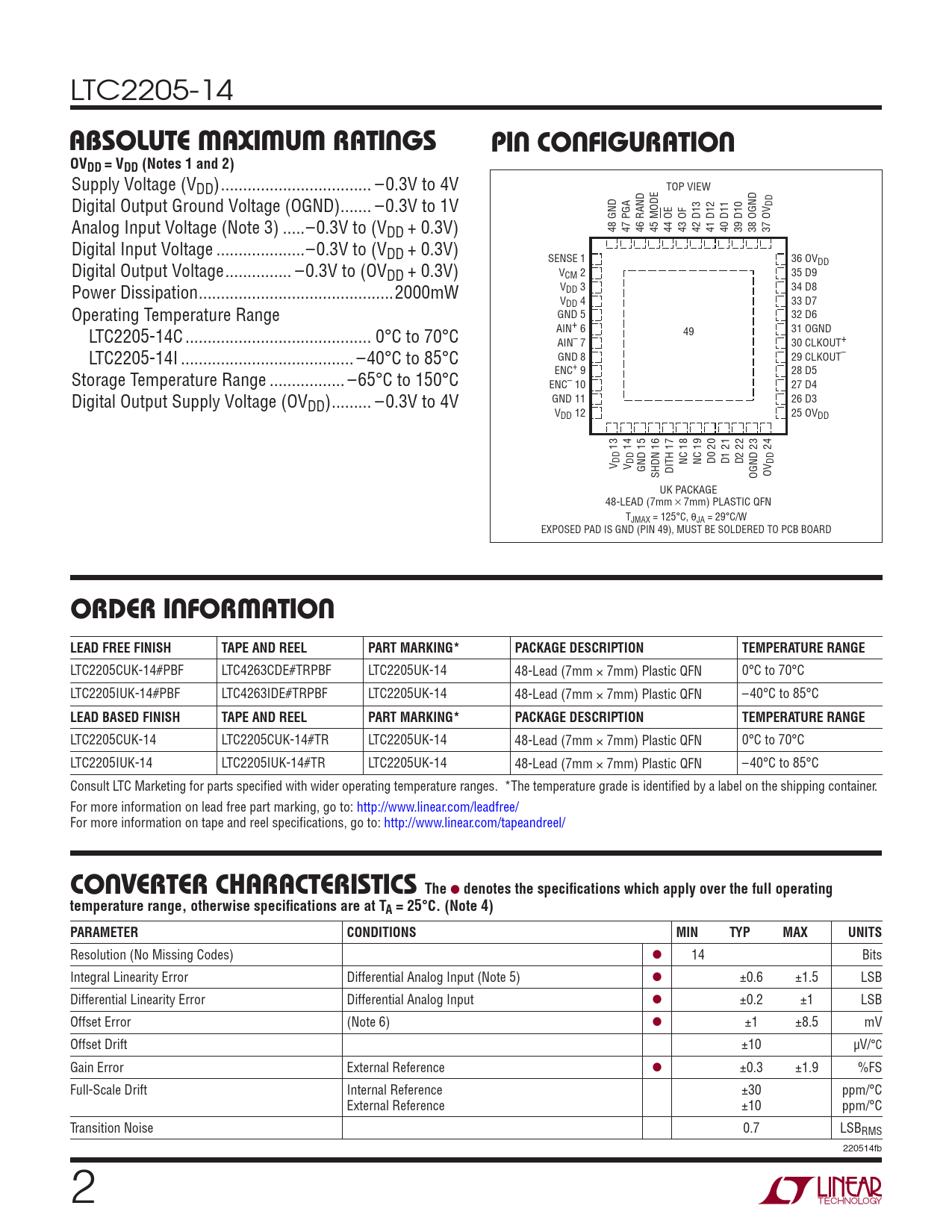 LTC2205CUK-14 LTC2205CUK-14#TR LTC2205UK-14 48-Lead (7mm × 7mm) Plastic QFN 0°C to 70°C LTC2205IUK-14 LTC2205IUK-14#TR LTC2205UK-14 48-Lead (7mm × 7mm) Plastic QFN –40°C to 85°C Consult LTC Marketing for parts specifi ed with wider operating temperature ranges. *The temperature grade is identifi ed by a label on the shipping container. For more information on lead free part marking, go to: http://www.linear.com/leadfree/ For more information on tape and reel specifi cations, go to: http://www.linear.com/tapeandreel/