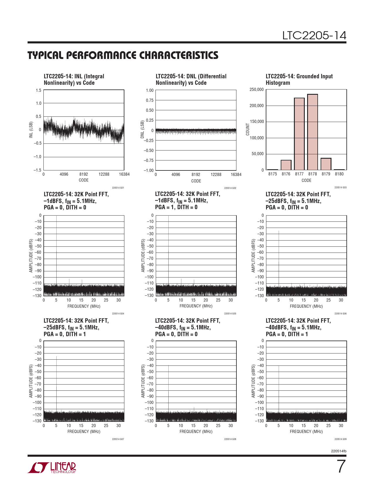 TYPICAL PERFORMANCE CHARACTERISTICS. LTC2205-14: INL (Integral. LTC2205-14: DNL (Differential. LTC2205-14: Grounded Input