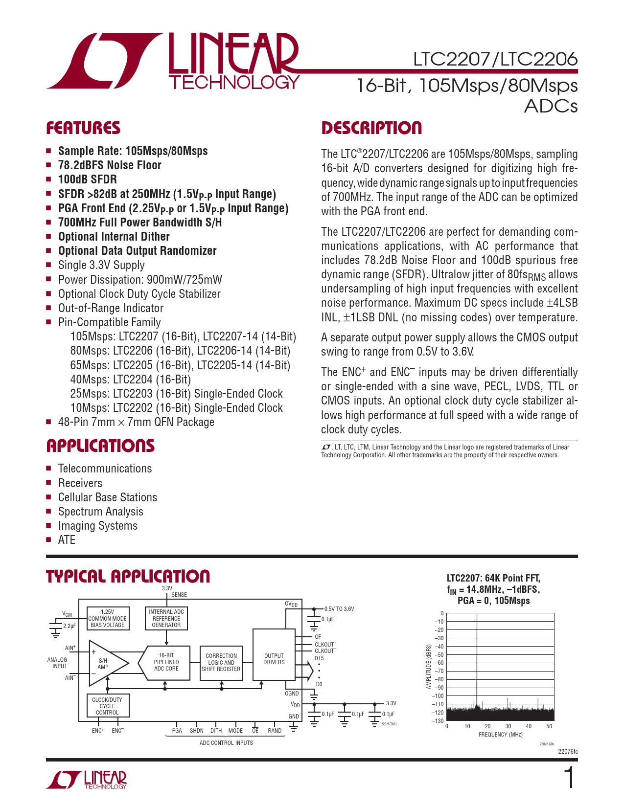 LTC2207/LTC2206 16-Bit, 105Msps/80Msps ADCs FEATURESDESCRIPTION ■ Sample Rate: 105Msps/80Msps The LTC®2207/LTC2206 are 105Msps/80Msps, sampling ■ 78.2dBFS Noise Floor 16-bit A/D converters designed for digitizing high fre- ■ 100dB SFDR quency, wide dynamic range signals up to input frequencies ■ SFDR >82dB at 250MHz (1.5VP-P Input Range) of 700MHz. The input range of the ADC can be optimized ■ PGA Front End (2.25VP-P or 1.5VP-P Input Range) with the PGA front end. ■ 700MHz Full Power Bandwidth S/H ■ The LTC2207/LTC2206 are perfect for demanding com- Optional Internal Dither ■ munications applications, with AC performance that Optional Data Output Randomizer ■ includes 78.2dB Noise Floor and 100dB spurious free Single 3.3V Supply ■ dynamic range (SFDR). Ultralow jitter of 80fsRMS allows Power Dissipation: 900mW/725mW ■ undersampling of high input frequencies with excellent Optional Clock Duty Cycle Stabilizer ■ noise performance. Maximum DC specs include ±4LSB Out-of-Range Indicator ■ INL, ±1LSB DNL (no missing codes) over temperature. Pin-Compatible Family 105Msps: LTC2207 (16-Bit), LTC2207-14 (14-Bit) A separate output power supply allows the CMOS output 80Msps: LTC2206 (16-Bit), LTC2206-14 (14-Bit) swing to range from 0.5V to 3.6V. 65Msps: LTC2205 (16-Bit), LTC2205-14 (14-Bit) The ENC+ and ENC– inputs may be driven differentially 40Msps: LTC2204 (16-Bit) or single-ended with a sine wave, PECL, LVDS, TTL or 25Msps: LTC2203 (16-Bit) Single-Ended Clock CMOS inputs. An optional clock duty cycle stabilizer al- 10Msps: LTC2202 (16-Bit) Single-Ended Clock lows high performance at full speed with a wide range of ■ 48-Pin 7mm × 7mm QFN Package clock duty cycles. APPLICATIONS L, LT, LTC, LTM, Linear Technology and the Linear logo are registered trademarks of Linear Technology Corporation. All other trademarks are the property of their respective owners. ■ Telecommunications ■ Receivers ■ Cellular Base Stations ■ Spectrum Analysis ■ Imaging Systems ■ ATE TYPICAL APPLICATIONLTC2207: 64K Point FFT, 3.3V f SENSE IN = 14.8MHz, –1dBFS, OV PGA = 0, 105Msps DD 0.5V TO 3.6V 1.25V INTERNAL ADC VCM 0 COMMON MODE REFERENCE 0.1μF –10 2.2μF BIAS VOLTAGE GENERATOR –20 OF –30 CLKOUT+ AIN+ –40 + CLKOUT– 16-BIT CORRECTION OUTPUT –50 ANALOG S/H D15 PIPELINED LOGIC AND DRIVERS –60 INPUT AMP • ADC CORE SHIFT REGISTER – • –70 AIN– • –80 D0 AMPLITUDE (dBFS) –90 OGND –100 CLOCK/DUTY CYCLE V 3.3V DD –110 CONTROL 0.1μF 0.1μF 0.1μF –120 GND –130 22076 TA01 0 10 20 30 40 50 ENC+ ENC– PGA SHDN DITH MODE OE RAND FREQUENCY (MHz) ADC CONTROL INPUTS 22076 G05 22076fc 1
