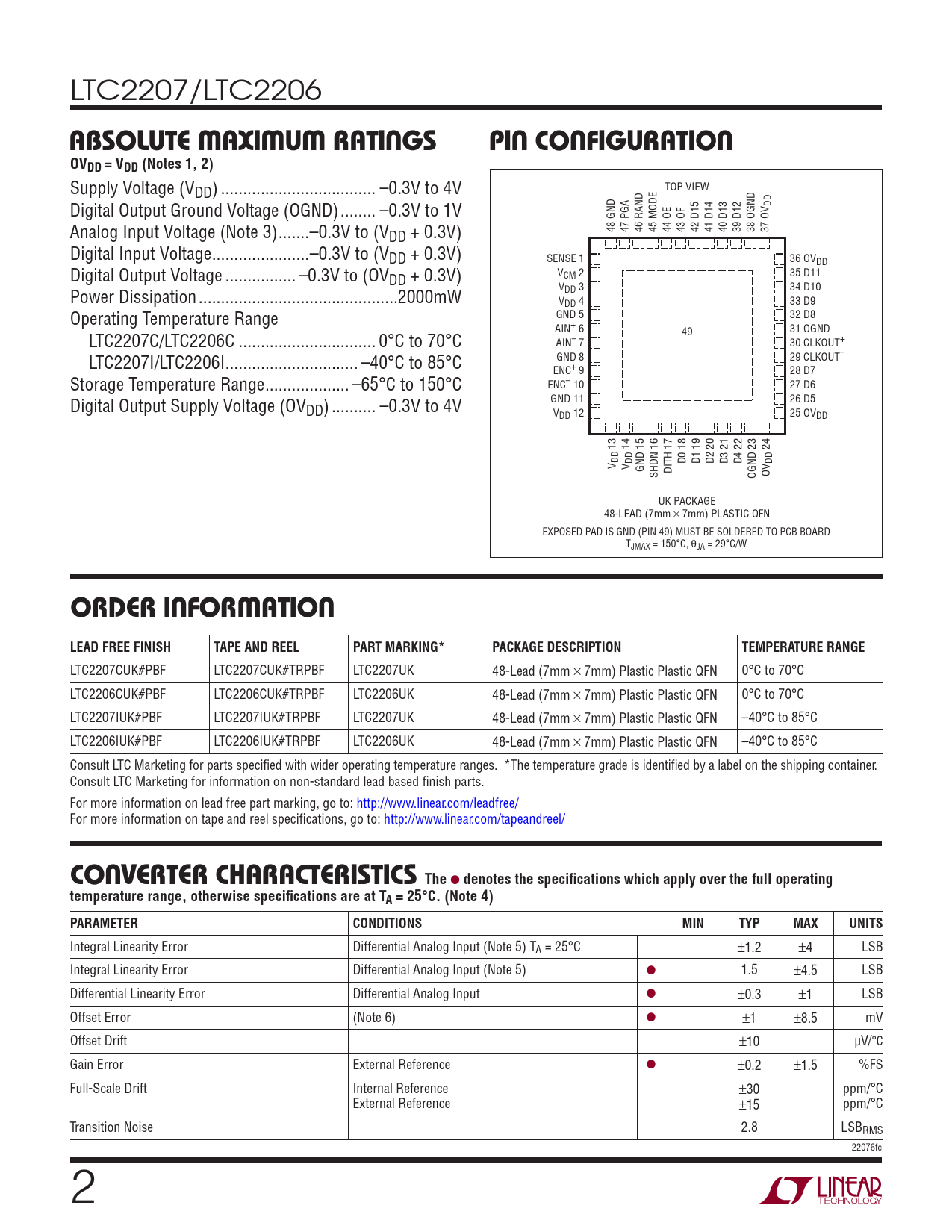 LTC2207CUK#PBF LTC2207CUK#TRPBF LTC2207UK 48-Lead (7mm × 7mm) Plastic Plastic QFN 0°C to 70°C LTC2206CUK#PBF LTC2206CUK#TRPBF LTC2206UK 48-Lead (7mm × 7mm) Plastic Plastic QFN 0°C to 70°C LTC2207IUK#PBF LTC2207IUK#TRPBF LTC2207UK 48-Lead (7mm × 7mm) Plastic Plastic QFN –40°C to 85°C LTC2206IUK#PBF LTC2206IUK#TRPBF LTC2206UK 48-Lead (7mm × 7mm) Plastic Plastic QFN –40°C to 85°C Consult LTC Marketing for parts specifi ed with wider operating temperature ranges. *The temperature grade is identifi ed by a label on the shipping container. Consult LTC Marketing for information on non-standard lead based fi nish parts. For more information on lead free part marking, go to: http://www.linear.com/leadfree/ For more information on tape and reel specifi cations, go to: http://www.linear.com/tapeandreel/