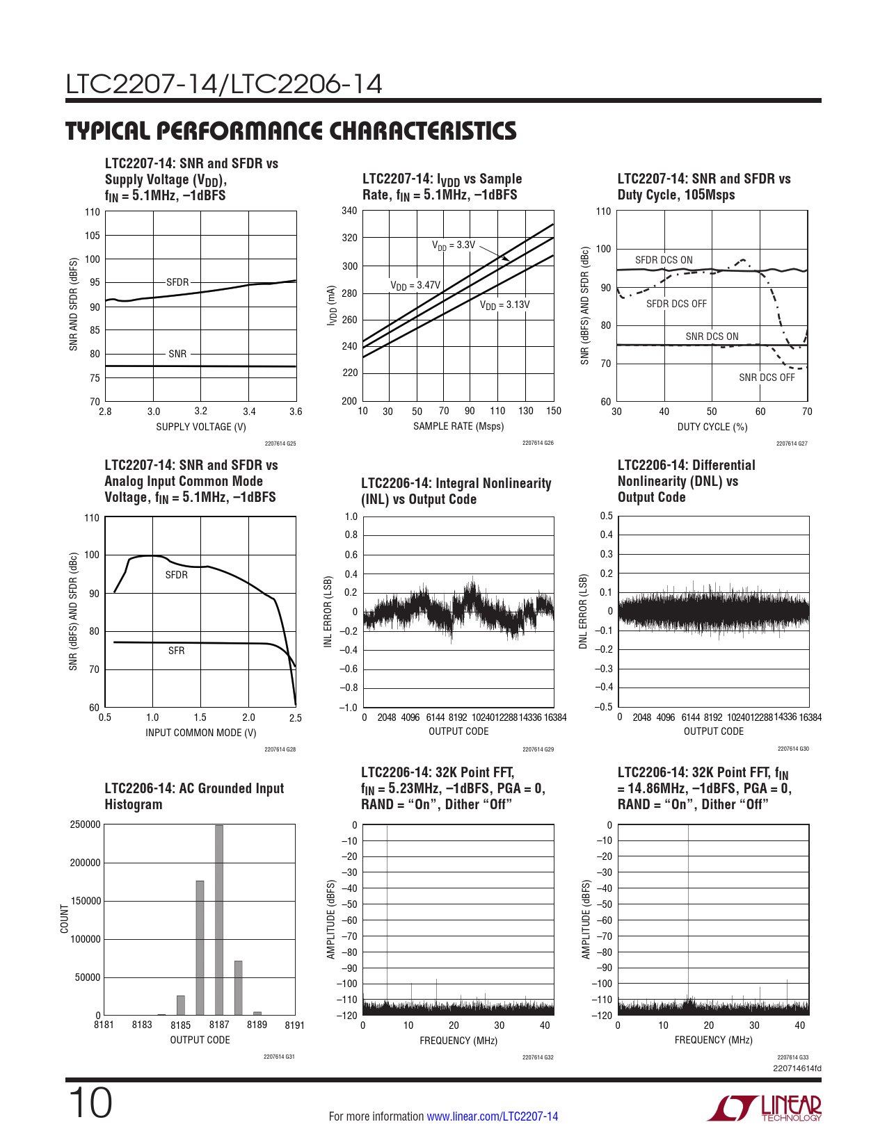 | Páginas / Página | 34 / 10 — Typical perForMance characTerisTics. LTC2207-14: SNR and SFDR vs. Supply … |