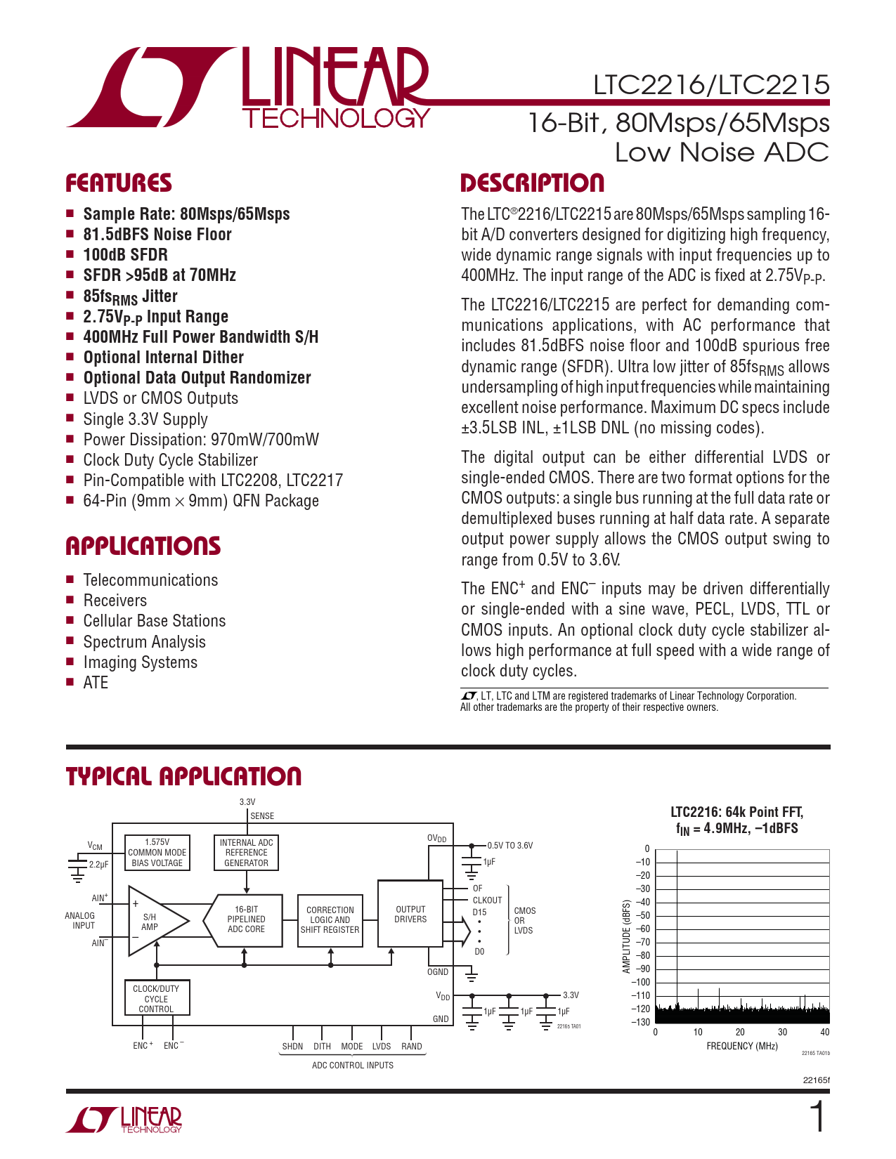LTC2216/LTC2215 16-Bit, 80Msps/65Msps Low Noise ADC FEATURESDESCRIPTION n Sample Rate: 80Msps/65Msps The LTC®2216/LTC2215 are 80Msps/65Msps sampling 16- n 81.5dBFS Noise Floor bit A/D converters designed for digitizing high frequency, n 100dB SFDR wide dynamic range signals with input frequencies up to n SFDR >95dB at 70MHz 400MHz. The input range of the ADC is fi xed at 2.75VP-P. n 85fsRMS Jitter The LTC2216/LTC2215 are perfect for demanding com- n 2.75VP-P Input Range munications applications, with AC performance that n 400MHz Full Power Bandwidth S/H includes 81.5dBFS noise fl oor and 100dB spurious free n Optional Internal Dither dynamic range (SFDR). Ultra low jitter of 85fsRMS allows n Optional Data Output Randomizer undersampling of high input frequencies while maintaining n LVDS or CMOS Outputs excellent noise performance. Maximum DC specs include n Single 3.3V Supply ±3.5LSB INL, ±1LSB DNL (no missing codes). n Power Dissipation: 970mW/700mW n Clock Duty Cycle Stabilizer The digital output can be either differential LVDS or n Pin-Compatible with LTC2208, LTC2217 single-ended CMOS. There are two format options for the n 64-Pin (9mm CMOS outputs: a single bus running at the full data rate or × 9mm) QFN Package demultiplexed buses running at half data rate. A separate APPLICATIONS output power supply allows the CMOS output swing to range from 0.5V to 3.6V. n Telecommunications The ENC+ and ENC– inputs may be driven differentially n Receivers or single-ended with a sine wave, PECL, LVDS, TTL or n Cellular Base Stations CMOS inputs. An optional clock duty cycle stabilizer al- n Spectrum Analysis lows high performance at full speed with a wide range of n Imaging Systems clock duty cycles. n ATE , LT, LTC and LTM are registered trademarks of Linear Technology Corporation. All other trademarks are the property of their respective owners. TYPICAL APPLICATION 3.3V SENSE LTC2216: 64k Point FFT,fIN = 4.9MHz, –1dBFS OV 1.575V INTERNAL ADC DD VCM 0.5V TO 3.6V COMMON MODE REFERENCE 0 2.2μF BIAS VOLTAGE GENERATOR 1μF –10 –20 OF –30 AIN+ + CLKOUT –40 16-BIT CORRECTION OUTPUT D15 CMOS ANALOG S/H PIPELINED –50 LOGIC AND DRIVERS • OR INPUT (dBFS) AMP ADC CORE SHIFT REGISTER LVDS –60 – • AIN– • –70 D0 –80 OGND AMPLITUDE –90 –100 CLOCK/DUTY CYCLE V 3.3V DD –110 CONTROL 1μF 1μF 1μF –120 GND –130 22165 TA01 0 10 20 30 40 ENC + ENC – SHDN DITH MODE LVDS RAND FREQUENCY (MHz) 22165 TA01b ADC CONTROL INPUTS 22165f 1