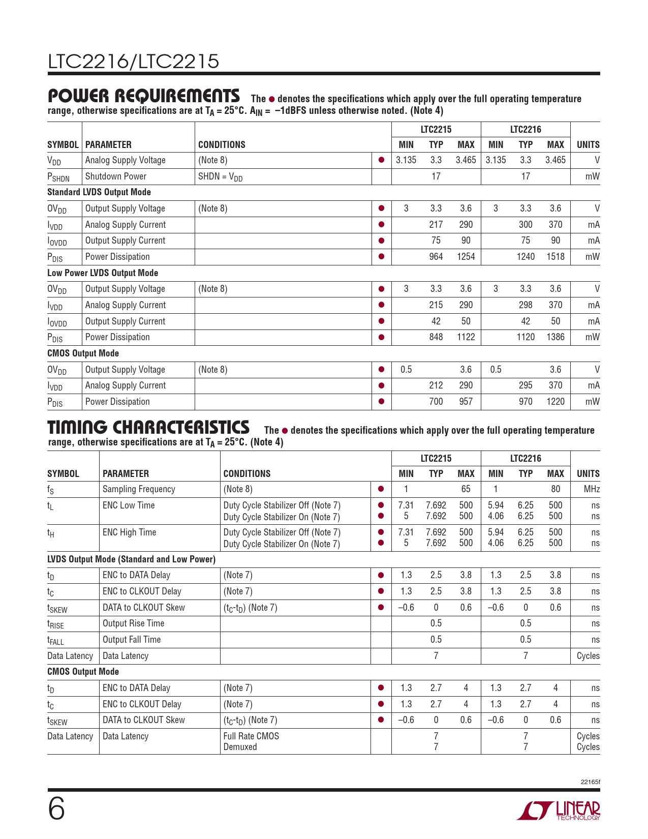 denotes the specifi cations which apply over the full operating temperature range, otherwise specifi cations are at TA = 25°C. (Note 4) LTC2215 LTC2216 SYMBOL PARAMETER CONDITIONS MIN TYP MAX MIN TYP MAX UNITS