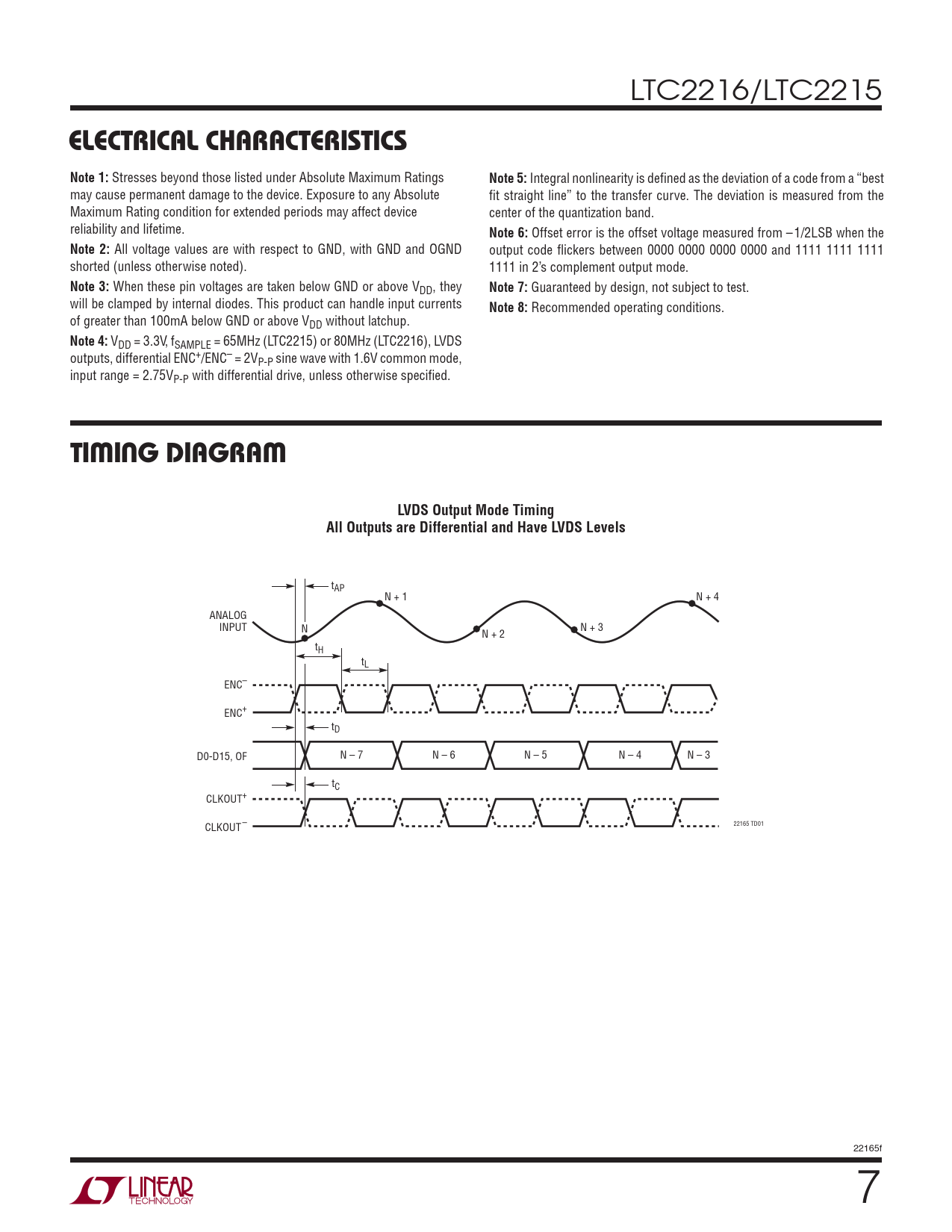 LTC2216/LTC2215 ELECTRICAL CHARACTERISTICSNote 1: Stresses beyond those listed under Absolute Maximum Ratings Note 5: Integral nonlinearity is defi ned as the deviation of a code from a “best may cause permanent damage to the device. Exposure to any Absolute fi t straight line” to the transfer curve. The deviation is measured from the Maximum Rating condition for extended periods may affect device center of the quantization band. reliability and lifetime. Note 6: Offset error is the offset voltage measured from – 1/2LSB when the Note 2: All voltage values are with respect to GND, with GND and OGND output code fl ickers between 0000 0000 0000 0000 and 1111 1111 1111 shorted (unless otherwise noted). 1111 in 2’s complement output mode. Note 3: When these pin voltages are taken below GND or above VDD, they Note 7: Guaranteed by design, not subject to test. will be clamped by internal diodes. This product can handle input currents Note 8: Recommended operating conditions. of greater than 100mA below GND or above VDD without latchup. Note 4: VDD = 3.3V, fSAMPLE = 65MHz (LTC2215) or 80MHz (LTC2216), LVDS outputs, differential ENC+/ENC– = 2VP-P sine wave with 1.6V common mode, input range = 2.75VP-P with differential drive, unless otherwise specifi ed. TIMING DIAGRAMLVDS Output Mode TimingAll Outputs are Differential and Have LVDS Levels tAP N + 1 N + 4 ANALOG INPUT N N + 3 N + 2 tH tL ENC– ENC+ tD D0-D15, OF N – 7 N – 6 N – 5 N – 4 N – 3 tC CLKOUT+ CLKOUT – 22165 TD01 22165f 7