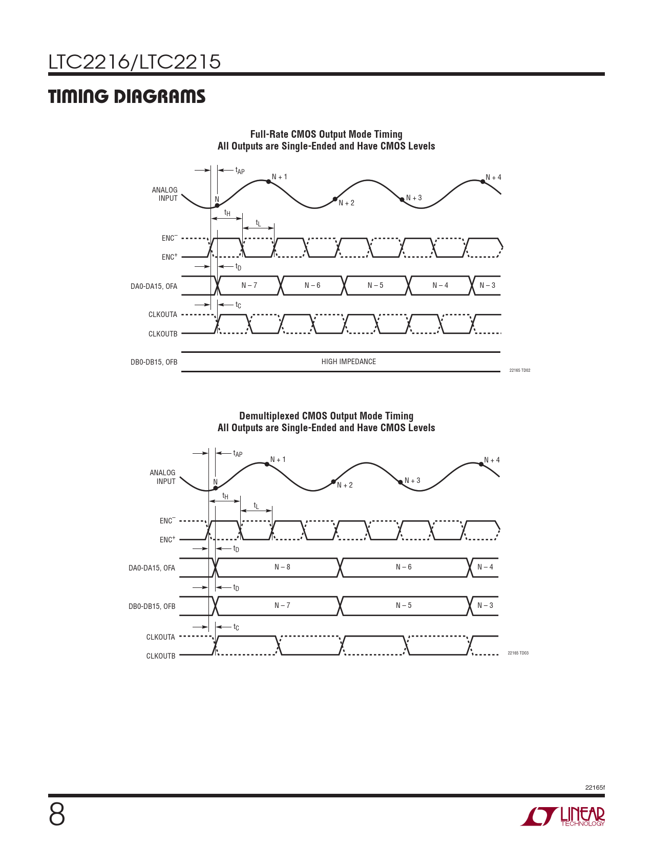 tAP N + 1 N + 4 ANALOG INPUT N N + 3 N + 2 tH tL ENC– ENC+ tD DA0-DA15, OFA N – 8 N – 6 N – 4 tD DB0-DB15, OFB N – 7 N – 5 N – 3 tC CLKOUTA CLKOUTB 22165 TD03 22165f 8