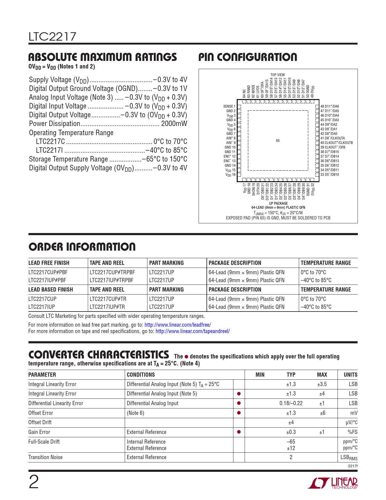 LTC2217CUP LTC2217CUP#TR LTC2217UP 64-Lead (9mm × 9mm) Plastic QFN 0°C to 70°C LTC2217IUP LTC2217IUP#TR LTC2217UP 64-Lead (9mm × 9mm) Plastic QFN –40°C to 85°C Consult LTC Marketing for parts specifi ed with wider operating temperature ranges. For more information on lead free part marking, go to: http://www.linear.com/leadfree/ For more information on tape and reel specifi cations, go to: http://www.linear.com/tapeandreel/