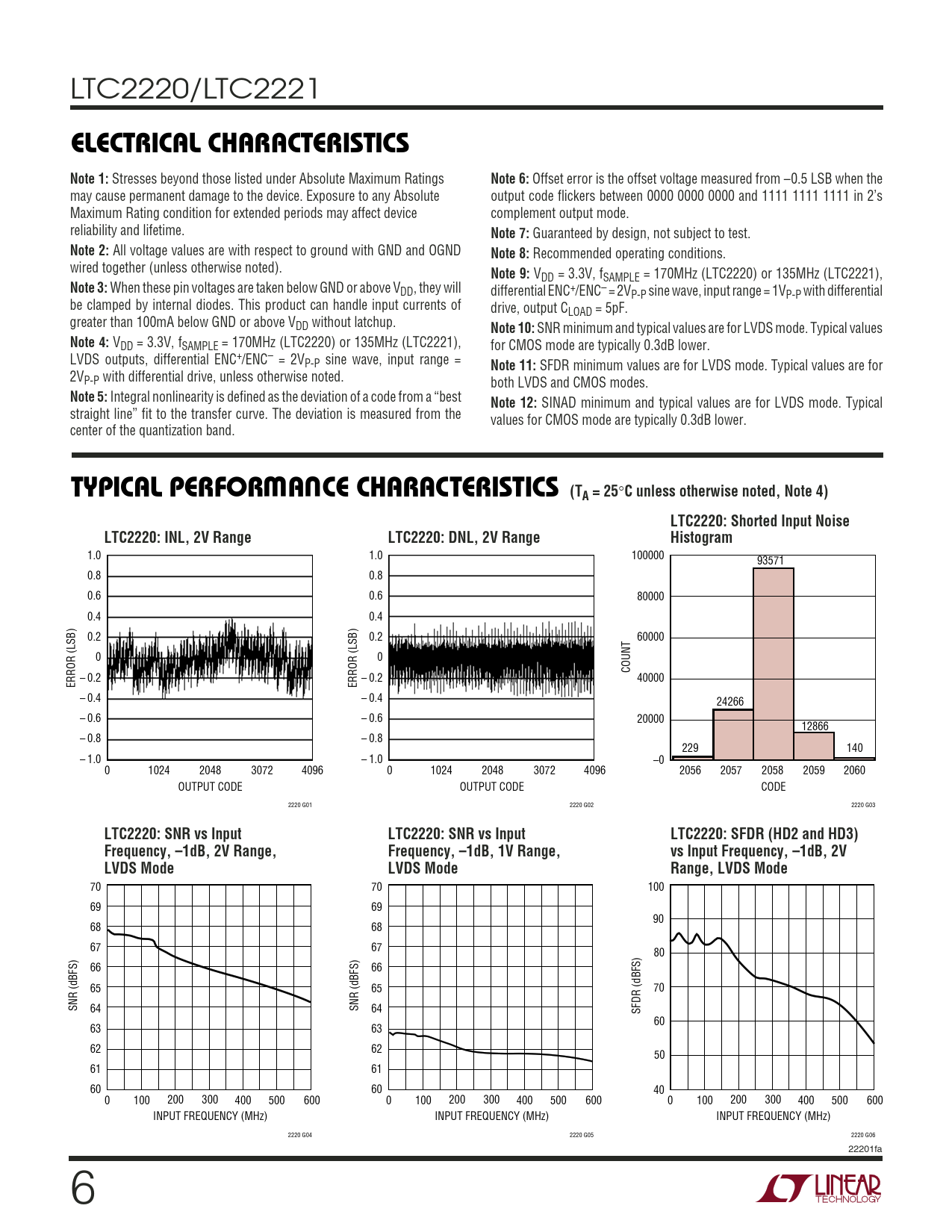 LTC2220/LTC2221 ELECTRICAL CHARACTERISTICSNote 1: Stresses beyond those listed under Absolute Maximum Ratings Note 6: Offset error is the offset voltage measured from –0.5 LSB when the may cause permanent damage to the device. Exposure to any Absolute output code flickers between 0000 0000 0000 and 1111 1111 1111 in 2’s Maximum Rating condition for extended periods may affect device complement output mode. reliability and lifetime. Note 7: Guaranteed by design, not subject to test. Note 2: All voltage values are with respect to ground with GND and OGND Note 8: Recommended operating conditions. wired together (unless otherwise noted). Note 9: VDD = 3.3V, fSAMPLE = 170MHz (LTC2220) or 135MHz (LTC2221), Note 3: When these pin voltages are taken below GND or above VDD, they will differential ENC+/ENC– = 2VP-P sine wave, input range = 1VP-P with differential be clamped by internal diodes. This product can handle input currents of drive, output CLOAD = 5pF. greater than 100mA below GND or above VDD without latchup. Note 10: SNR minimum and typical values are for LVDS mode. Typical values Note 4: VDD = 3.3V, fSAMPLE = 170MHz (LTC2220) or 135MHz (LTC2221), for CMOS mode are typically 0.3dB lower. LVDS outputs, differential ENC+/ENC– = 2VP-P sine wave, input range = Note 11: SFDR minimum values are for LVDS mode. Typical values are for 2VP-P with differential drive, unless otherwise noted. both LVDS and CMOS modes. Note 5: Integral nonlinearity is defined as the deviation of a code from a “best Note 12: SINAD minimum and typical values are for LVDS mode. Typical straight line” fit to the transfer curve. The deviation is measured from the values for CMOS mode are typically 0.3dB lower. center of the quantization band. WUTYPICAL PERFOR A CE CHARACTERISTICS (TA = 25 ° C unless otherwise noted, Note 4)LTC2220: Shorted Input NoiseLTC2220: INL, 2V RangeLTC2220: DNL, 2V RangeHistogram 1.0 1.0 100000 93571 0.8 0.8 0.6 0.6 80000 0.4 0.4 0.2 0.2 60000 0 0 COUNT – 0.2 – 0.2 40000 ERROR (LSB) ERROR (LSB) – 0.4 – 0.4 24266 – 0.6 – 0.6 20000 12866 – 0.8 – 0.8 229 140 – 1.0 – 1.0 –0 0 1024 2048 3072 4096 0 1024 2048 3072 4096 2056 2057 2058 2059 2060 OUTPUT CODE OUTPUT CODE CODE 2220 G01 2220 G02 2220 G03 LTC2220: SNR vs InputLTC2220: SNR vs InputLTC2220: SFDR (HD2 and HD3)Frequency, –1dB, 2V Range,Frequency, –1dB, 1V Range,vs Input Frequency, –1dB, 2VLVDS ModeLVDS ModeRange, LVDS Mode 70 70 100 69 69 90 68 68 67 67 80 66 66 65 65 70 SNR (dBFS) 64 SNR (dBFS) 64 SFDR (dBFS) 60 63 63 62 62 50 61 61 60 60 40 0 100 200 300 400 500 600 0 100 200 300 400 500 600 0 100 200 300 400 500 600 INPUT FREQUENCY (MHz) INPUT FREQUENCY (MHz) INPUT FREQUENCY (MHz) 2220 G04 2220 G05 2220 G06 22201fa 6