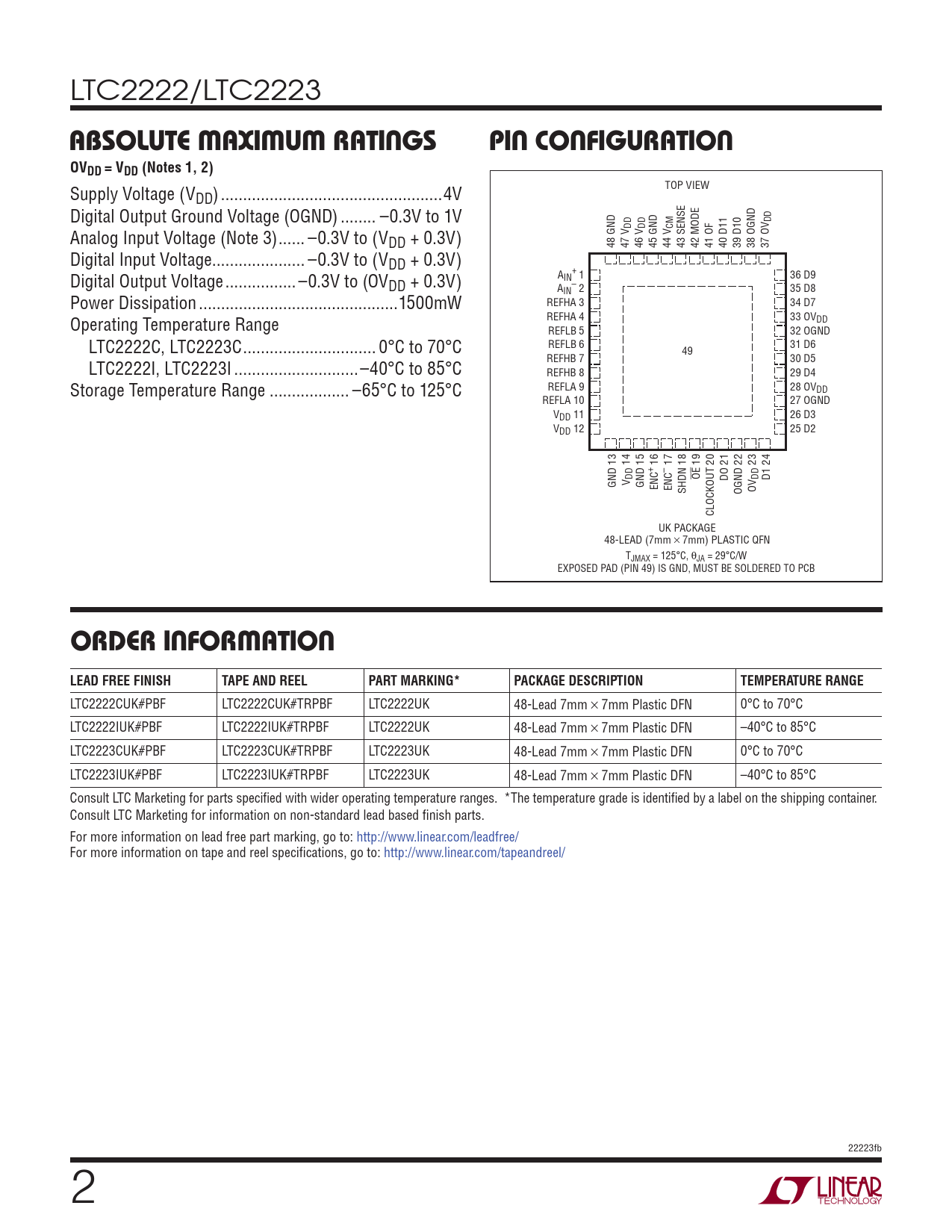 LTC2222CUK#PBF LTC2222CUK#TRPBF LTC2222UK 48-Lead 7mm × 7mm Plastic DFN 0°C to 70°C LTC2222IUK#PBF LTC2222IUK#TRPBF LTC2222UK 48-Lead 7mm × 7mm Plastic DFN –40°C to 85°C LTC2223CUK#PBF LTC2223CUK#TRPBF LTC2223UK 48-Lead 7mm × 7mm Plastic DFN 0°C to 70°C LTC2223IUK#PBF LTC2223IUK#TRPBF LTC2223UK 48-Lead 7mm × 7mm Plastic DFN –40°C to 85°C Consult LTC Marketing for parts specifi ed with wider operating temperature ranges. *The temperature grade is identifi ed by a label on the shipping container. Consult LTC Marketing for information on non-standard lead based fi nish parts. For more information on lead free part marking, go to: http://www.linear.com/leadfree/ For more information on tape and reel specifi cations, go to: http://www.linear.com/tapeandreel/ 22223fb 2