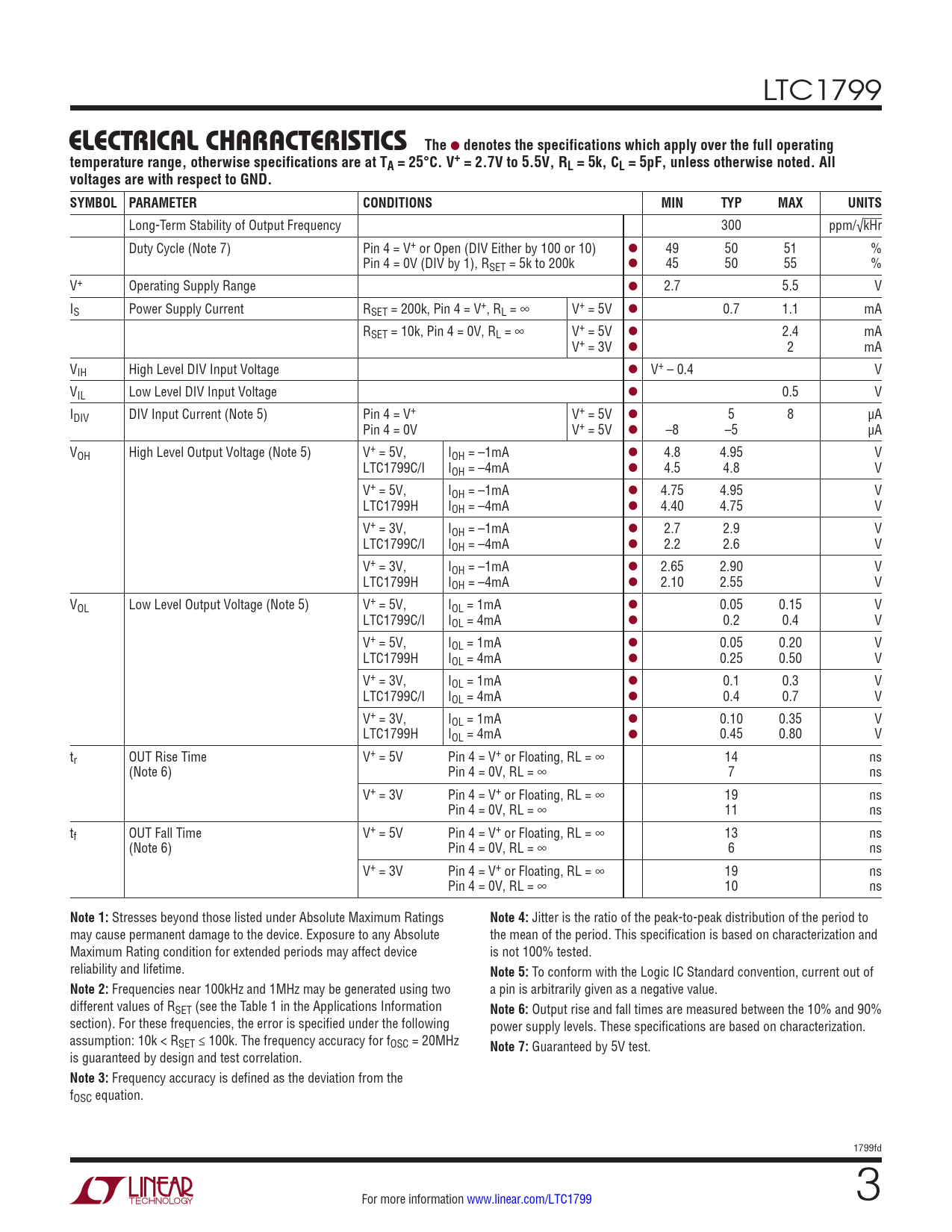 Long-Term Stability of Output Frequency 300 ppm/√kHr Duty Cycle (Note 7) Pin 4 = V+ or Open (DIV Either by 100 or 10) l 49 50 51 % Pin 4 = 0V (DIV by 1), RSET = 5k to 200k l 45 50 55 % V+ Operating Supply Range l 2.7 5.5 V IS Power Supply Current RSET = 200k, Pin 4 = V+, RL = ∞ V+ = 5V l 0.7 1.1 mA RSET = 10k, Pin 4 = 0V, RL = ∞ V+ = 5V l 2.4 mA V+ = 3V l 2 mA VIH High Level DIV Input Voltage l V+ – 0.4 V VIL Low Level DIV Input Voltage l 0.5 V IDIV DIV Input Current (Note 5) Pin 4 = V+ V+ = 5V l 5 8 µA Pin 4 = 0V V+ = 5V l –8 –5 µA VOH High Level Output Voltage (Note 5) V+ = 5V, IOH = –1mA l 4.8 4.95 V LTC1799C/I IOH = –4mA l 4.5 4.8 V V+ = 5V, IOH = –1mA l 4.75 4.95 V LTC1799H IOH = –4mA l 4.40 4.75 V V+ = 3V, IOH = –1mA l 2.7 2.9 V LTC1799C/I IOH = –4mA l 2.2 2.6 V V+ = 3V, IOH = –1mA l 2.65 2.90 V LTC1799H IOH = –4mA l 2.10 2.55 V VOL Low Level Output Voltage (Note 5) V+ = 5V, IOL = 1mA l 0.05 0.15 V LTC1799C/I IOL = 4mA l 0.2 0.4 V V+ = 5V, IOL = 1mA l 0.05 0.20 V LTC1799H IOL = 4mA l 0.25 0.50 V V+ = 3V, IOL = 1mA l 0.1 0.3 V LTC1799C/I IOL = 4mA l 0.4 0.7 V V+ = 3V, IOL = 1mA l 0.10 0.35 V LTC1799H IOL = 4mA l 0.45 0.80 V tr OUT Rise Time V+ = 5V Pin 4 = V+ or Floating, RL = ∞ 14 ns (Note 6) Pin 4 = 0V, RL = ∞ 7 ns V+ = 3V Pin 4 = V+ or Floating, RL = ∞ 19 ns Pin 4 = 0V, RL = ∞ 11 ns tf OUT Fall Time V+ = 5V Pin 4 = V+ or Floating, RL = ∞ 13 ns (Note 6) Pin 4 = 0V, RL = ∞ 6 ns V+ = 3V Pin 4 = V+ or Floating, RL = ∞ 19 ns Pin 4 = 0V, RL = ∞ 10 ns