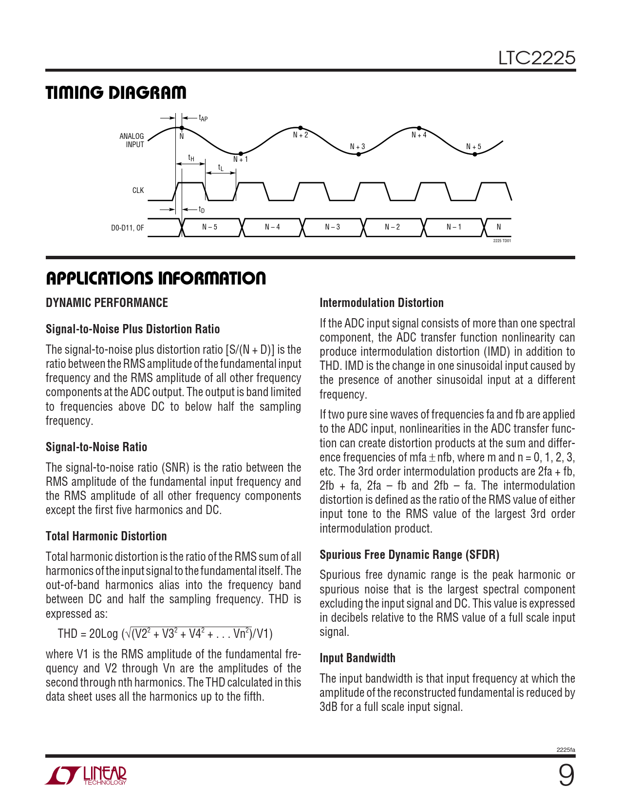 LTC2225 W UWTI I G DIAGRA tAP N + 2 N + 4 ANALOG N INPUT N + 3 N + 5 tH N + 1 tL CLK tD D0-D11, OF N – 5 N – 4 N – 3 N – 2 N – 1 N 2225 TD01 UUWUAPPLICATIO S I FOR ATIODYNAMIC PERFORMANCEIntermodulation Distortion If the ADC input signal consists of more than one spectral Signal-to-Noise Plus Distortion Ratio component, the ADC transfer function nonlinearity can The signal-to-noise plus distortion ratio [S/(N + D)] is the produce intermodulation distortion (IMD) in addition to ratio between the RMS amplitude of the fundamental input THD. IMD is the change in one sinusoidal input caused by frequency and the RMS amplitude of all other frequency the presence of another sinusoidal input at a different components at the ADC output. The output is band limited frequency. to frequencies above DC to below half the sampling If two pure sine waves of frequencies fa and fb are applied frequency. to the ADC input, nonlinearities in the ADC transfer func- Signal-to-Noise Ratio tion can create distortion products at the sum and differ- ence frequencies of mfa ± nfb, where m and n = 0, 1, 2, 3, The signal-to-noise ratio (SNR) is the ratio between the etc. The 3rd order intermodulation products are 2fa + fb, RMS amplitude of the fundamental input frequency and 2fb + fa, 2fa – fb and 2fb – fa. The intermodulation the RMS amplitude of all other frequency components distortion is defined as the ratio of the RMS value of either except the first five harmonics and DC. input tone to the RMS value of the largest 3rd order intermodulation product. Total Harmonic Distortion Total harmonic distortion is the ratio of the RMS sum of all Spurious Free Dynamic Range (SFDR) harmonics of the input signal to the fundamental itself. The Spurious free dynamic range is the peak harmonic or out-of-band harmonics alias into the frequency band spurious noise that is the largest spectral component between DC and half the sampling frequency. THD is excluding the input signal and DC. This value is expressed expressed as: in decibels relative to the RMS value of a full scale input THD = 20Log (√(V22 + V32 + V42 + . Vn2)/V1) signal. where V1 is the RMS amplitude of the fundamental fre- Input Bandwidth quency and V2 through Vn are the amplitudes of the second through nth harmonics. The THD calculated in this The input bandwidth is that input frequency at which the data sheet uses all the harmonics up to the fifth. amplitude of the reconstructed fundamental is reduced by 3dB for a full scale input signal. 2225fa 9