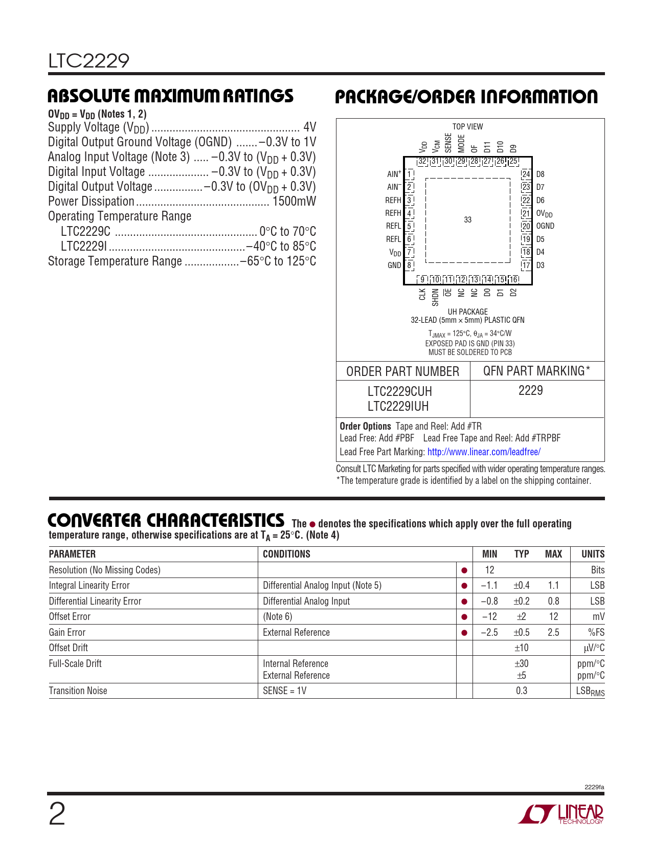 LTC2229 WWWUUWUABSOLUTE AXI URATI GSPACKAGE/ORDER I FOR ATIOOVDD = VDD (Notes 1, 2) Supply Voltage (VDD) ... 4V TOP VIEW Digital Output Ground Voltage (OGND) ... –0.3V to 1V DD CM V V SENSE MODE OF D11 D10 D9 Analog Input Voltage (Note 3) ... –0.3V to (VDD + 0.3V) 32 31 30 29 28 27 26 25 Digital Input Voltage .. –0.3V to (VDD + 0.3V) AIN+ 1 24 D8 Digital Output Voltage .. –0.3V to (OVDD + 0.3V) AIN– 2 23 D7 Power Dissipation .. 1500mW REFH 3 22 D6 Operating Temperature Range REFH 4 21 OVDD 33 LTC2229C ... 0°C to 70°C REFL 5 20 OGND REFL 6 19 D5 LTC2229I ...–40°C to 85°C V 7 18 DD D4 Storage Temperature Range ..–65°C to 125°C GND 8 17 D3 9 10 11 12 13 14 15 16 OE CLK NC NC D0 D1 D2 SHDN UH PACKAGE 32-LEAD (5mm × 5mm) PLASTIC QFN TJMAX = 125°C, θJA = 34°C/W EXPOSED PAD IS GND (PIN 33) MUST BE SOLDERED TO PCB ORDER PART NUMBER QFN PART MARKING* LTC2229CUH 2229 LTC2229IUH Order Options Tape and Reel: Add #TR Lead Free: Add #PBF Lead Free Tape and Reel: Add #TRPBF Lead Free Part Marking: http://www.linear.com/leadfree/ Consult LTC Marketing for parts specified with wider operating temperature ranges. *The temperature grade is identified by a label on the shipping container. UCO VERTER CHARACTERISTICS The ● denotes the specifications which apply over the full operatingtemperature range, otherwise specifications are at TA = 25 ° C. (Note 4)PARAMETERCONDITIONSMINTYPMAXUNITS Resolution (No Missing Codes) ● 12 Bits Integral Linearity Error Differential Analog Input (Note 5) ● –1.1 ±0.4 1.1 LSB Differential Linearity Error Differential Analog Input ● –0.8 ±0.2 0.8 LSB Offset Error (Note 6) ● –12 ±2 12 mV Gain Error External Reference ● –2.5 ±0.5 2.5 %FS Offset Drift ±10 µV/°C Full-Scale Drift Internal Reference ±30 ppm/°C External Reference ±5 ppm/°C Transition Noise SENSE = 1V 0.3 LSBRMS 2229fa 2