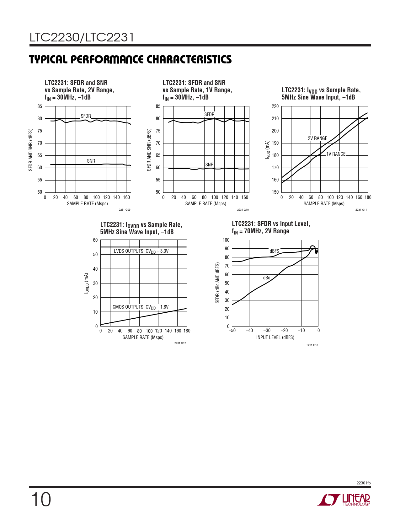 60 100 90 LVDS OUTPUTS, OVDD = 3.3V dBFS 50 80 70 40 60 dBc (mA) 30 50 I OVDD 40 20 SFDR (dBc AND dBFS) 30 CMOS OUTPUTS, OVDD = 1.8V 20 10 10 0 0 0 20 40 60 80 100 120 140 160 180 –50 –40 –30 –20 –10 0 SAMPLE RATE (Msps) INPUT LEVEL (dBFS) 2231 G12 2231 G13 22301fb 10